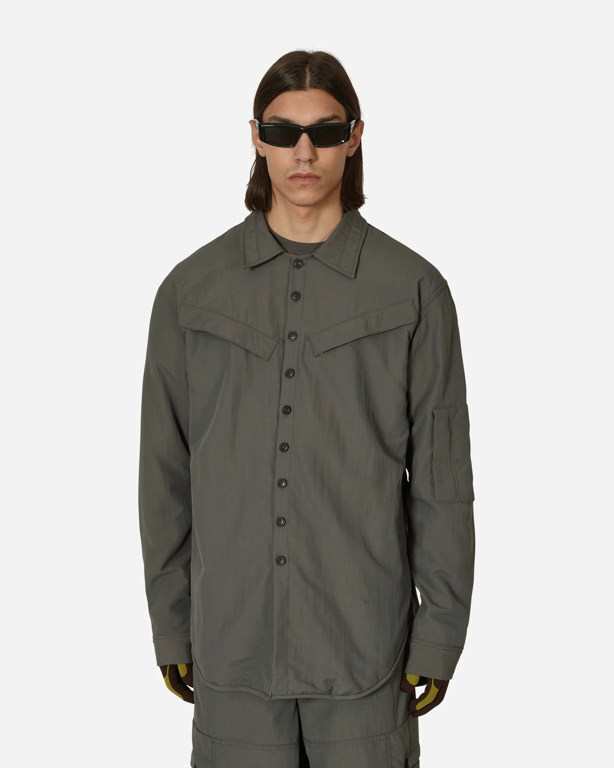 Bryan Jimenèz Pilot Shirt Dry Grey Based in New York, the Dominican-born designer continues to develop his brand with a strong military and utilitarian outlook, reworking fits and proportions. The Pilote shirt is based on the classic military overshirt but is made from a durable fabric and a relaxed fit. A must-have to elevate your -first outfits. - 100% Nylon - Lining: 100% Cotton - Spread Collar - Button Closure - Two Zip Chest Pockets - Utility Zip Pocket at Sleeve - Adjustable Cuffs - Curved Hem - Made in New York - Style Code: BJSS23S-3 1 SIZE & FIT Model is 6ft 1in/1.83m with 37"/92cm chest and wears size L. Measures (Size L): 55cm Shoulders, 55cm Chest, 68cm Sleeve, 80cm Length, 60cm Hem.
