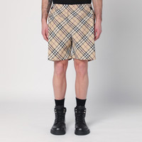 Bermuda shorts by Burberry in beige tones with an all-over Check pattern, featuring an elasticized waist with drawstring, a patch pocket on the back with flap and tone-on-tone Equestrian Knight Design logo, two side zip pockets, and a comfortable fit.