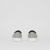PRODUCT DETAILS Slip-on sneakers in two-tone canvas and leather, accented with a logo print. The sole is made with bio-based TPU, primarily obtained from renewable sources. Upper: 93% cotton, 6% polyester, 1% sheep leather Lining: 85% sheep leather, 9% polyamide, 4% polyurethane, 2% polyester Sole: 100% polyurethane Slip-on style Burberry lettering at front Made in Italy 80387031