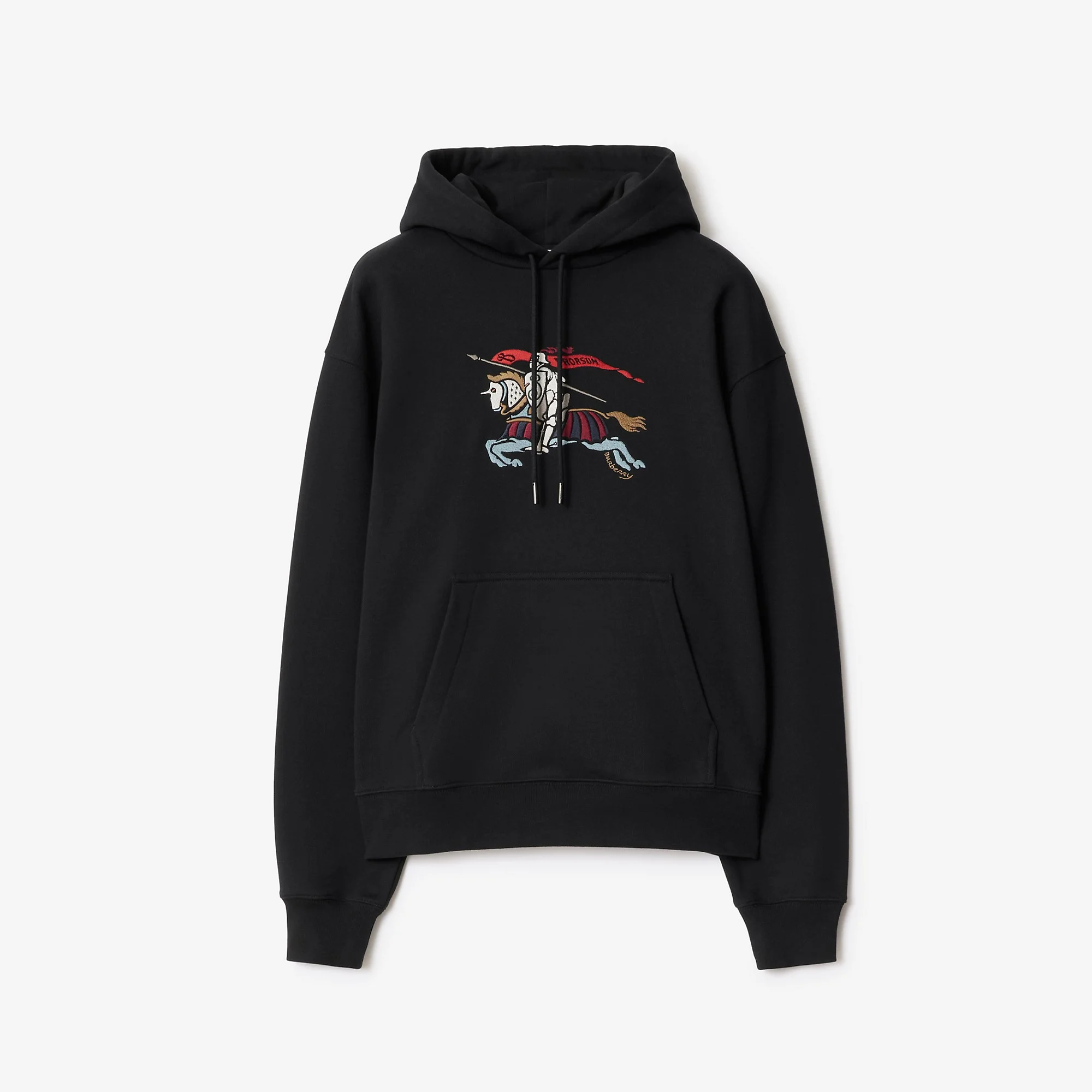 Product Details A hoodie made from lightweight loop-back cotton, cut to a relaxed fit. The style is embroidered with a colourful take on our Equestrian Knight Design. - Drawcord hood - Pouch pockets - Rib-knit trims - Embroidered Burberry lettering at chest - Relaxed fit: a looser cut than our regular fit. - Machine wash - Item 81151261 Size & Fit - Length: 69cm/27.2in (size UK S) - Model’s height: 188cm/6ft 2in. Model wears size UK S Fabric & Care - 100% cotton - Trim: 99% cotton, 1% elastane - Made in Portugal