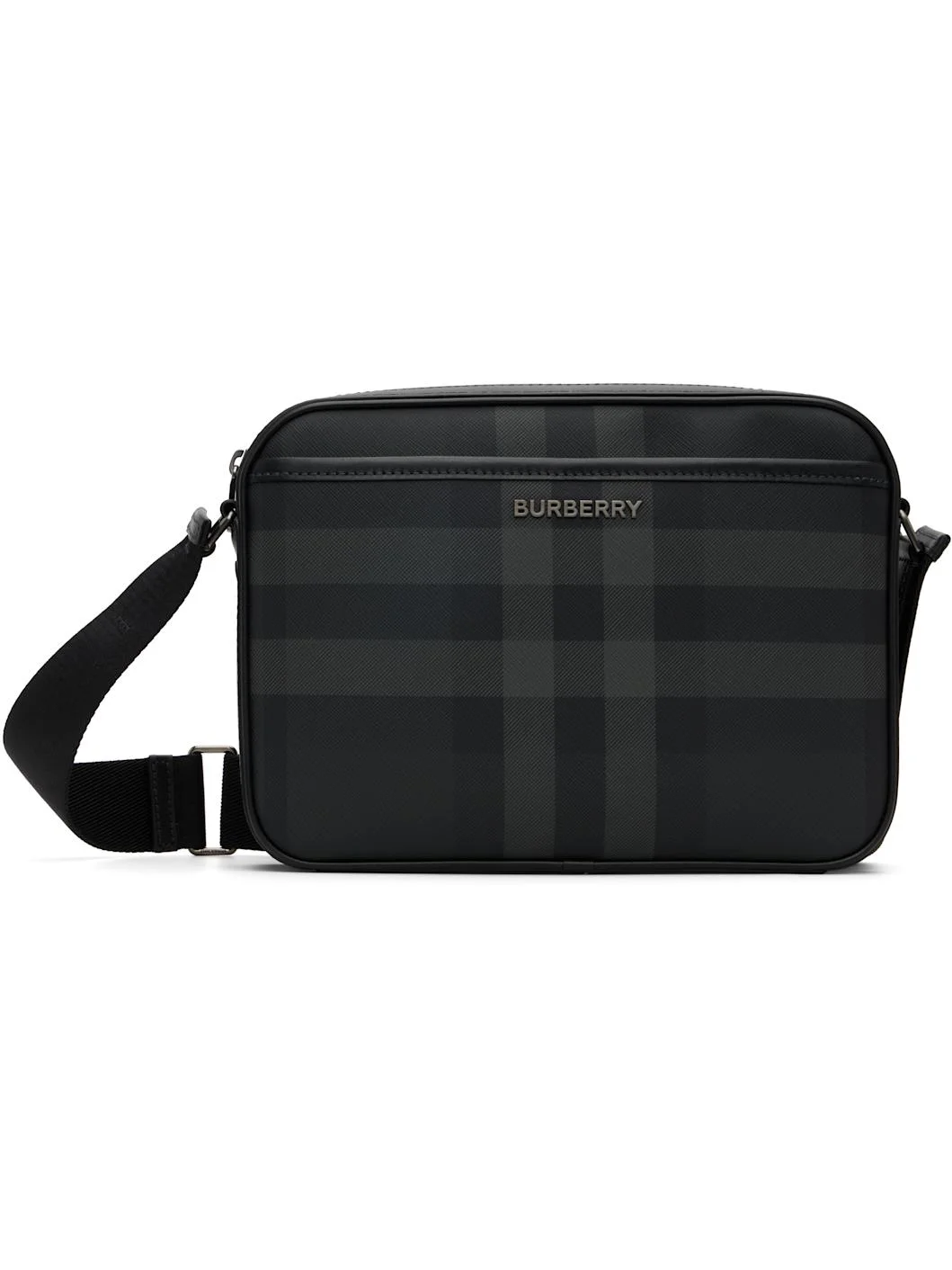 Coated canvas and buffed calfskin messenger bag. · Check pattern throughout · Adjustable crossbody strap · Patch pocket and logo hardware at face · Zip closure · Patch pocket at interior · Twill lining · H8" x W10" x D2.5" Supplier color: Charcoal Textile, calfskin. Made in Romania 261376M170005
