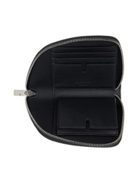 Grained leather wallet in black. · Hand-painted edges throughout · Logo graphic embossed at face · Zip closure · Four card slots · Central note slot · Buffed lambskin lining · H4" x W6" x D1" Supplier color: Black