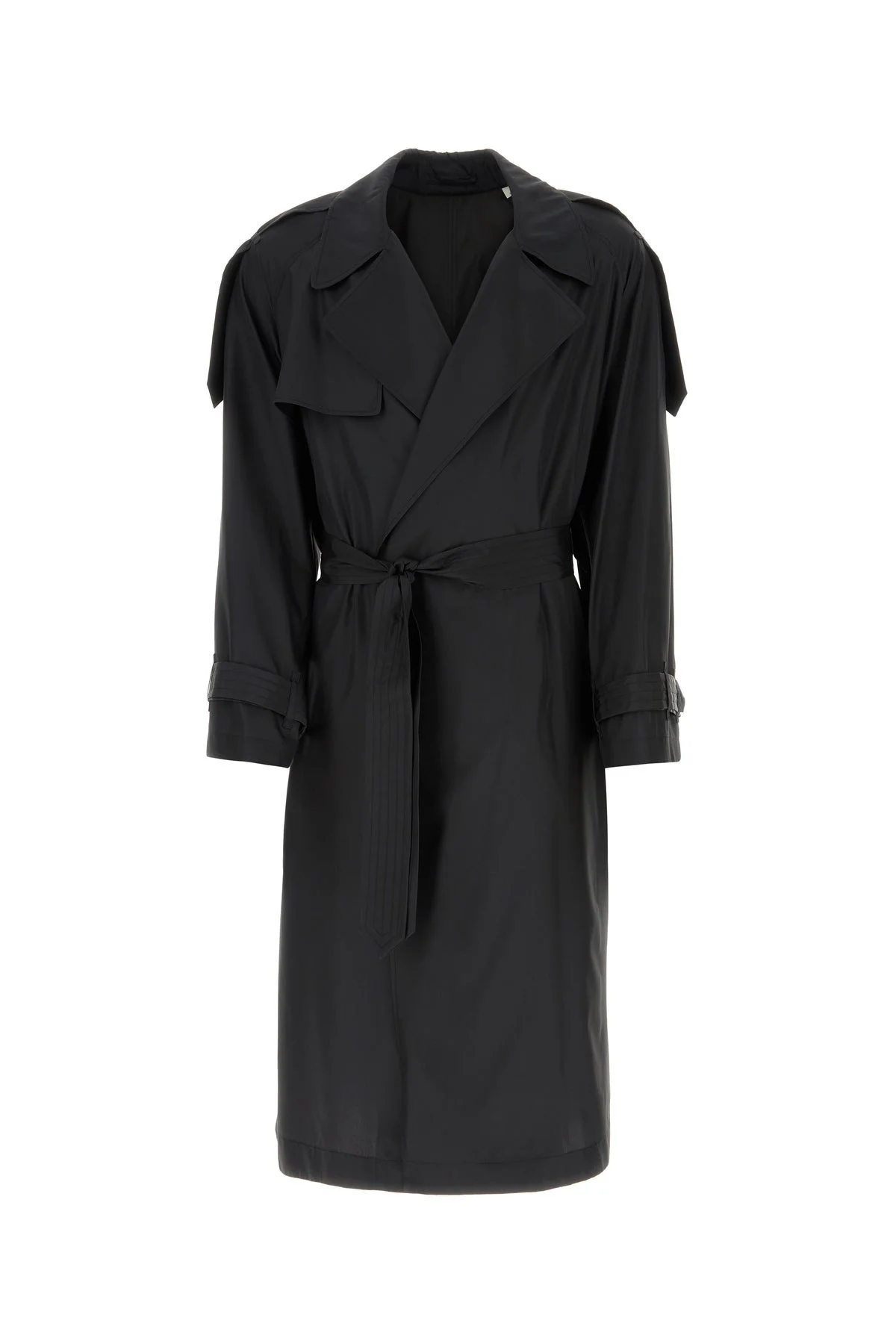 Medium-cut trench coat realized in pure silk characterized by belt to tie closure at the waist. - Lapels - Gun flap and storm shield - Epaulettes - Adjustable straps on the cuffs - Central slit at the back - Unlined DETAILS Black silk trench coat Exterior: 100% Silk Made in Sample size: 48