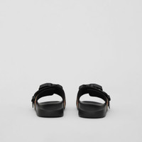 PRODUCT DETAILS Slides in padded Vintage check containing organic cotton, highlighted with a logo-tagged buckled strap. The styles features a contoured insole for comfort. Upper: 75% cotton, 20% polyester, 5% calf leather Lining: 100% polyester Sole: 100% rubber Buckle: 100% ABS Slip-on style Printed Burberry lettering at strap Imported 80569171