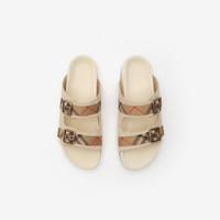 Product Details A pair of sandals crafted in Italy from soft suede embossed with a check pattern, set on a grooved sole moulded with archive Burberry lettering. The design is finished with adjustable B buckle straps, jacquard-woven with the Burberry Check in our signature sand beige colourway. - Rounded toe - Burberry lettering at sole - Comes with a dust bag - Item 81188891 Fabric & Care - Upper: 70% calf suede, 24% polyamide, 6% polyester - Trim: 50% zinc alloy, 50% brass - Lining: 55% leather, 31% polyester, 14% polyurethane - Sole: 100% thermoplastic polyurethane - Made in Italy