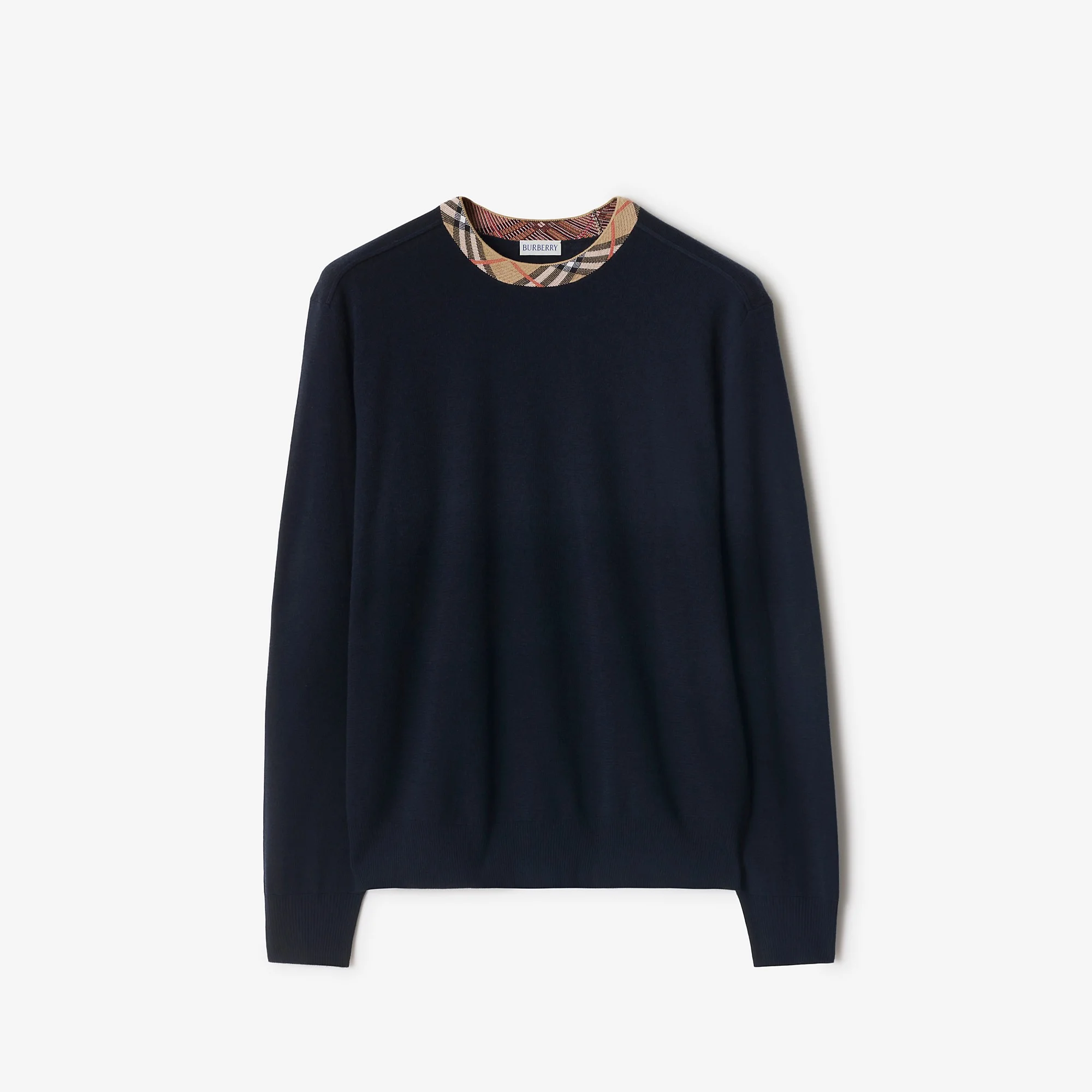 Product Details A crew-neck sweater in lightweight wool, cut to a regular fit. The style is knitted at the neckline with the Burberry Check in our signature sand colourway. - Rib-knit trims - Regular fit. Fits true to size, take your normal size. - Item 81130851 Size & Fit - Length: 65.5cm/25.7in (size UK M) - Model's height: 187cm/6ft 2in. Model wears size UK M Fabric & Care - 100% wool - Trims: 93% cotton, 6% polyamide, 1% elastane; 98% wool, 1% elastane, 1% polyamide - Specialist dry clean - Imported