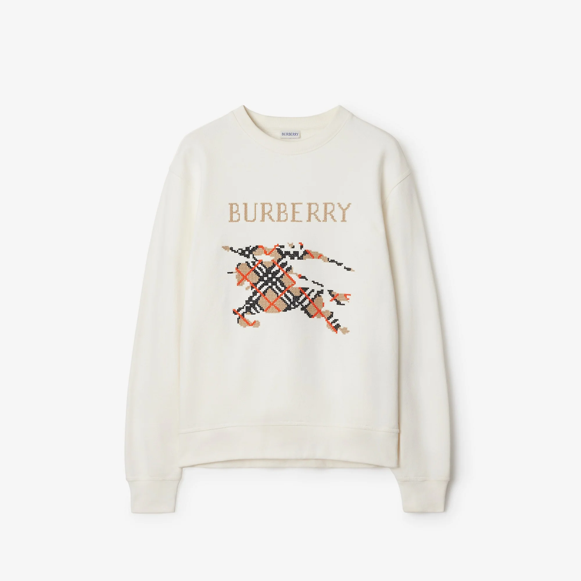 Product Details A crew-neck sweatshirt made from lightweight loop-back cotton. Cut to a relaxed fit, the style is cross-stitched with our logo and Equestrian Knight Design in Burberry Check. - Rib-knit trims - Relaxed fit: a looser cut than our regular fit. - Machine wash - Item 81105471 Size & Fit - Length: 72cm/28.4in (size UK M) - Model’s height: 190cm/6ft 3in. Model wears size UK M Fabric & Care - 100% cotton* - Trims: 99% cotton, 1% elastane; 100% polyester - *The main material of this product contains at least 70% cotton, all of which is organically grown - Made in Portugal