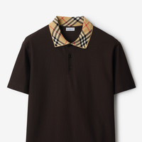 Product Details A polo shirt in lightweight cotton pique, topped with a knitted Burberry Check collar in our signature sand beige colourway. The design is cut to a slim fit. - Button placket - Slim fit: this style is cut to a fitted silhouette. Fits true to size, take your normal size. - Machine wash - Item 81160071 Size & Fit - Length: 71.5cm/28.2in (size UK L) - Model’s height: 187cm/6ft 2in. Model wears size UK L Fabric & Care - 100% cotton - Trim: 100% cotton - Buttons: mother-of-pearl - Made in Portugal