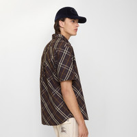 Product Details A short-sleeved cotton shirt woven with the Burberry Check in a seasonal truffle brown colourway. The style is cut to a relaxed fit. - Button closure - Point collar - Curved hem - Relaxed fit: a looser cut than our regular fit. - Item 81161271 Size & Fit - Length: 76.5cm/30.1in (size UK L) - Model’s height: 191cm/6ft 3in. Model wears size UK L Fabric & Care - 100% cotton - Buttons: mother-of-pearl - Specialist dry clean - Imported