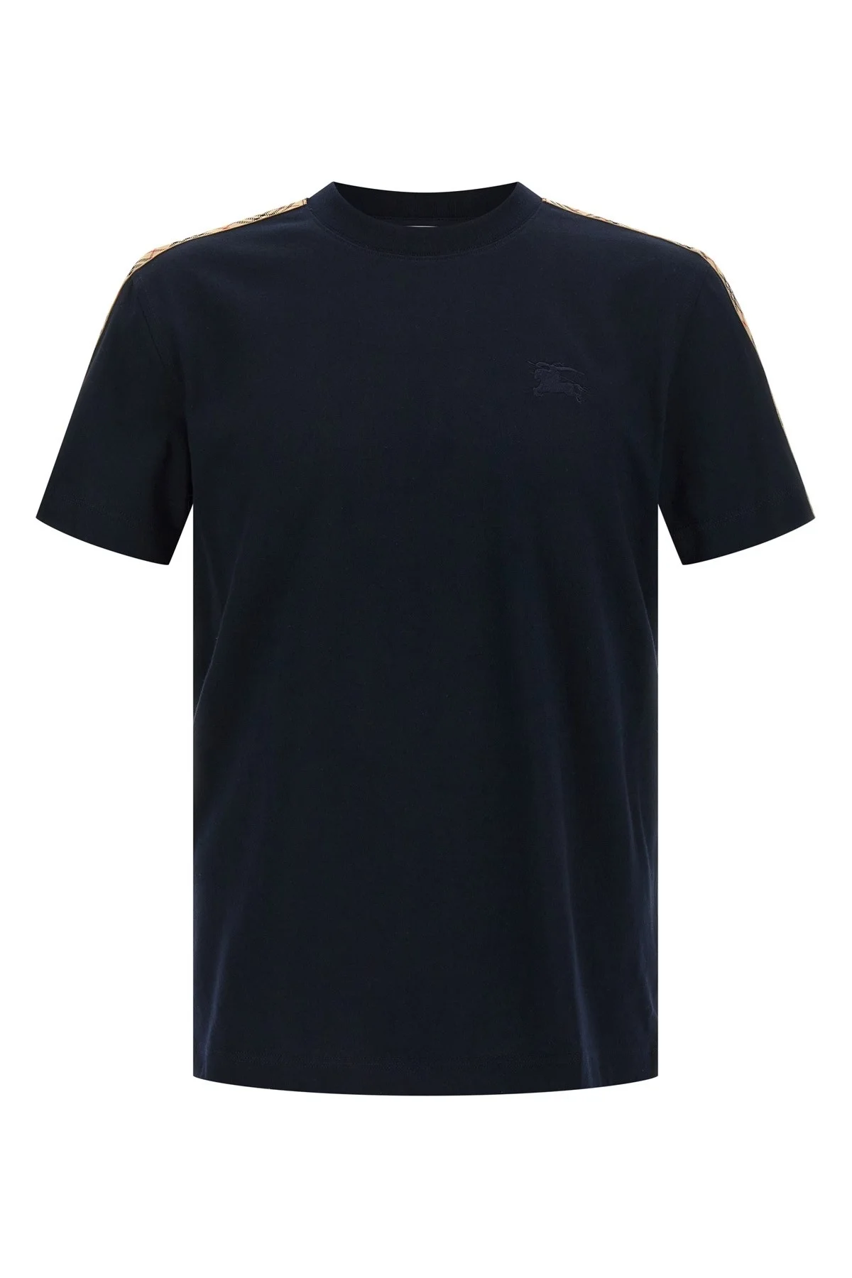 cod. 8123257NAVY 'Seth' cotton jersey T-shirt with tone-on-tone Equestrian Knight Design embroidery on the front, crew neck, Burberry Check print grosgrain detail on the shoulders, short sleeves. Color: Blue Size & Fit: true to size fit Composition: 100% cotton Made in: Vietnam