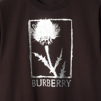 Product Details A T-shirt made from lightweight cotton jersey, cut to a relaxed fit. The style is printed with a metallic logo and thistle – a hardy wildflower synonymous with the British Isles. - Rib-knit neckline - Printed Burberry lettering at front - Relaxed fit: a looser cut than our regular fit. - Machine wash - Item 81168871 Size & Fit - Length: 74cm/29.1in (size UK L) Fabric & Care - 100% cotton - Trim: 97% cotton, 3% elastane - Made in Portugal
