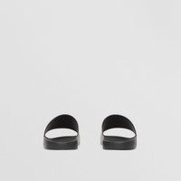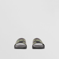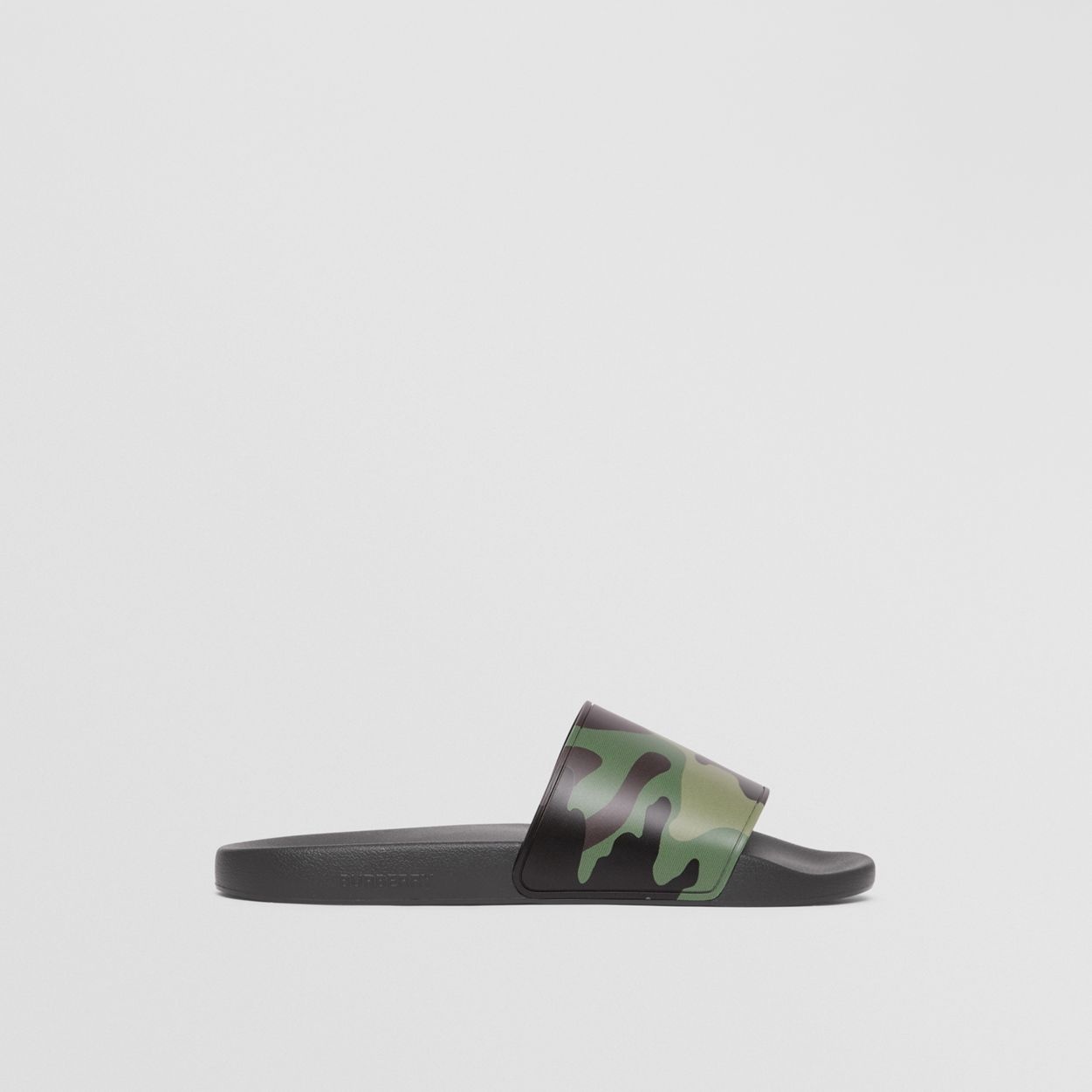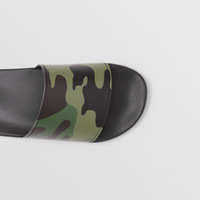 PRODUCT DETAILS Slides highlighted with our camouflage print, featuring a contoured insole for comfort. Upper: 100% thermoplastic polyurethane Sole: 100% rubber Slip-on style Raised Burberry lettering at sole Imported 80427121