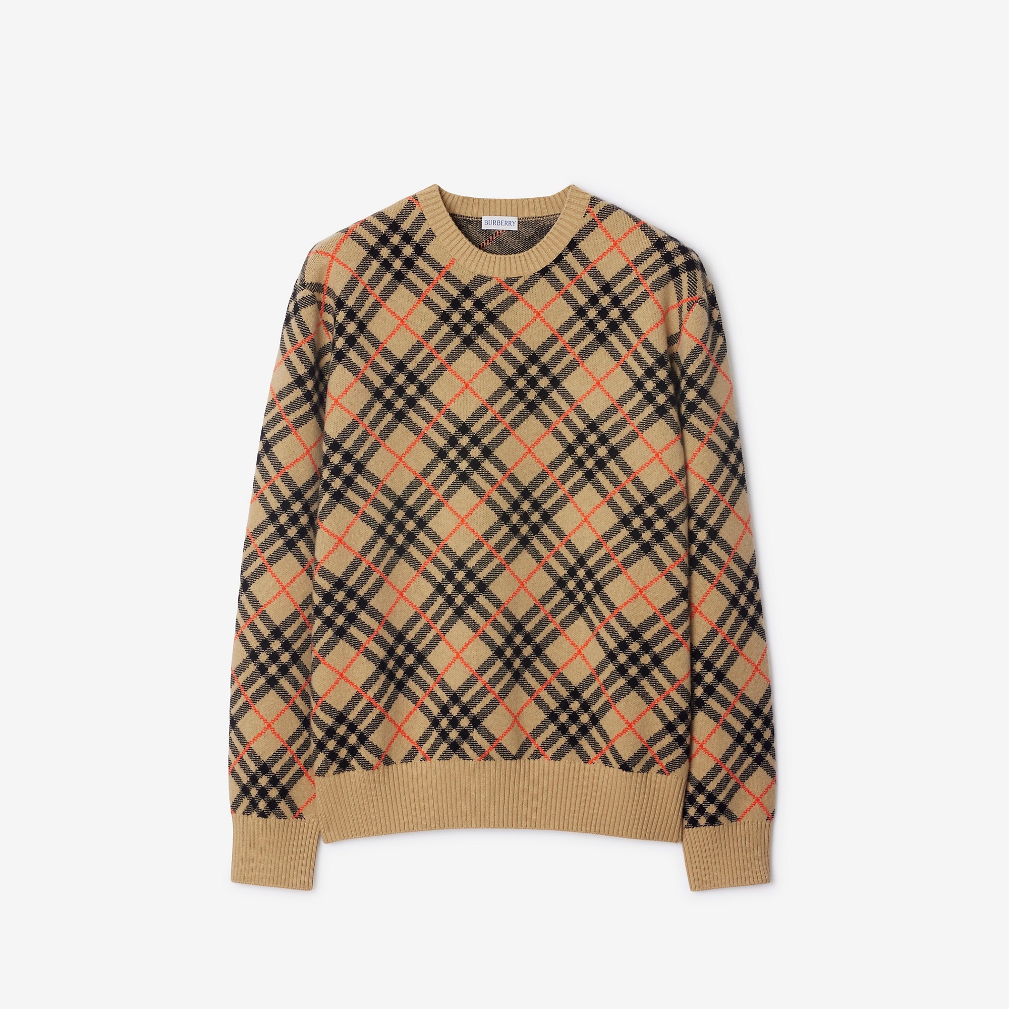 Product Details A sweater made in Italy from cashmere, jacquard-knitted with the Burberry Check. The heavyweight style is cut to a relaxed fit. - Rib-knit trims - Relaxed fit: a looser cut than our regular fit. Consider taking a size down. - Item 80986751 Size & Fit - Length: 70.5cm/27.8in (size UK L) - Model’s height: 186cm/6ft 1in. Model wears size UK L Fabric & Care - 100% cashmere - Trim: 94% cashmere, 5% polyamide, 1% elastane - Specialist dry clean - Made in Italy