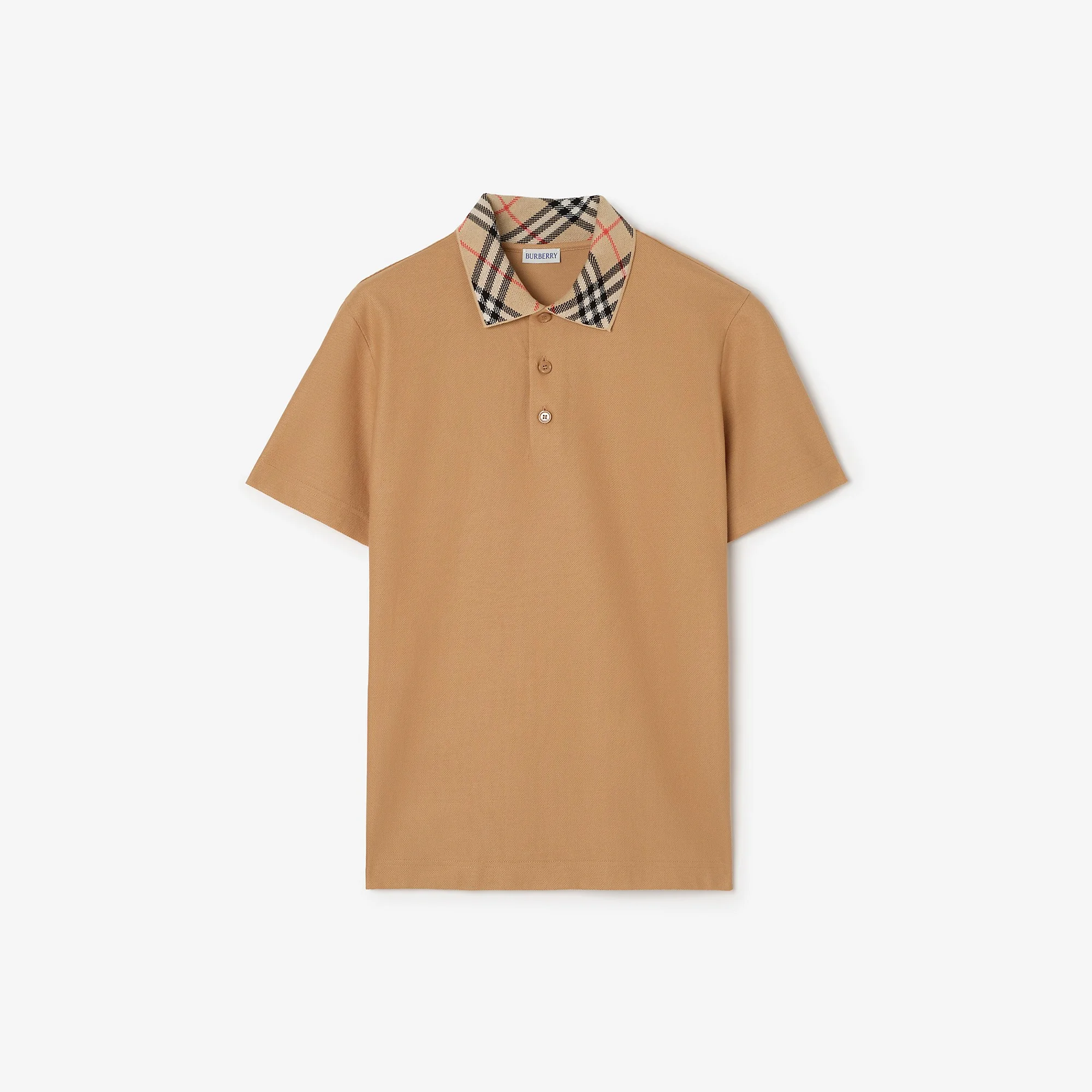 Product Details Slim fit: this style is cut to a fitted silhouette. Fits true to size, take your normal size. A polo shirt in lightweight cotton pique. The design is cut to a slim fit and knitted with our Burberry Check in signature sand beige at the collar. - Button placket - Machine wash - Item 81269641 Size & Fit - Slim fit: this style is cut to a fitted silhouette. Fits true to size, take your normal size. - Length: 71.5cm/28.2in (size UK L) Fabric & Care - 100% cotton - Collar: 100% cotton - Buttons: mother-of-pearl - Made in Portugal