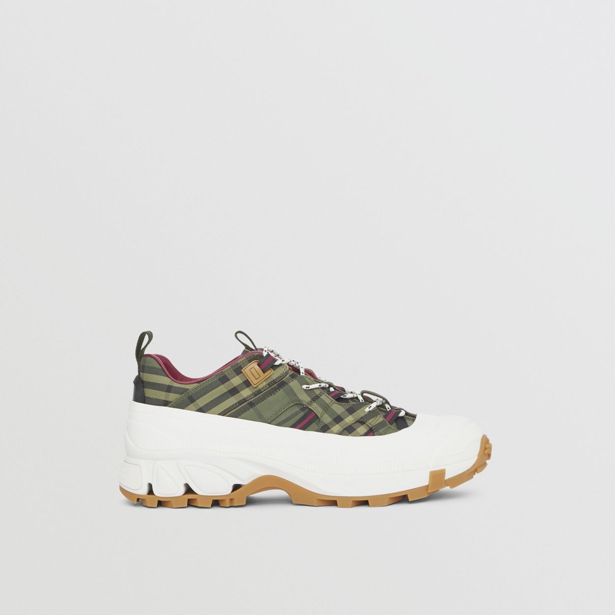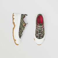 PRODUCT DETAILS Our runway sneaker crafted in check cotton with leather trims. The style is capped with a matte overshoe inspired by rain boots and a cross-detailed tread referencing our iconic check. Upper: 98% cotton, 2% calf leather Trim: 70% polyamide, 30% polyester Lining: 86% sheep leather, 14% goat suede Sole: 100% polyurethane Lace-up closure Silicone patch with raised Burberry lettering at tongue, embossed Burberry lettering at heel Made in Italy 80430991