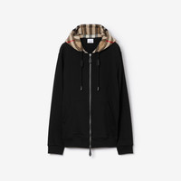 Product Details A zip hoodie in loop-back cotton jersey with a contrasting hood in Burberry Check cotton flannel. The design is cut to a relaxed fit and has calf leather trims. - Two-way zip closure - Drawcord hood - Pouch pockets - Rib-knit trims - Relaxed fit: a looser cut than our regular fit. Consider taking a size down. - Machine wash - *Containing organic cotton - Item 80607051 Size & Fit - Length: 75cm/29.5in (size UK L) - Model’s height: 189cm/6ft 2in. Model wears size UK L Fabric & Care - 100% cotton* - Hood: 100% cotton - Trims: 98% cotton, 2% elastane; 100% calf leather - Imported