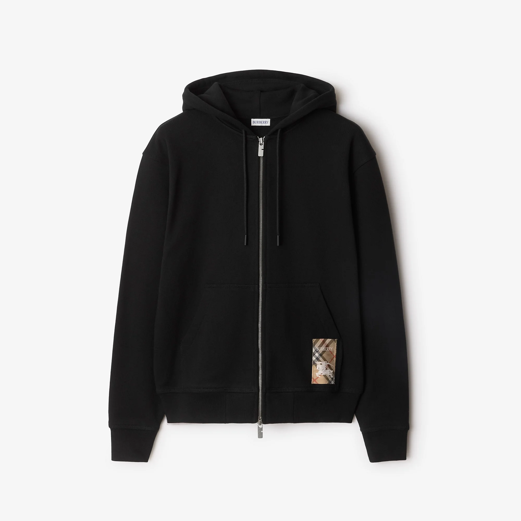 Product Details A zip hoodie made from lightweight loop-back cotton, knitted to a relaxed fit. Reworking the label from our signature trench coats, the style features an appliqued patch woven with the Burberry Check, logo and Equestrian Knight Design. - Two-way zip closure - Drawcord hood - Pouch pockets - Rib-knit trims - Appliqued Burberry Check label at front - Relaxed fit: a looser cut than our regular fit. - Machine wash - Item 81022761 Size & Fit - Length: 71cm/28in (size UK L) Fabric & Care - 100% cotton - Trim: 99% cotton, 1% elastane - Made in Portugal