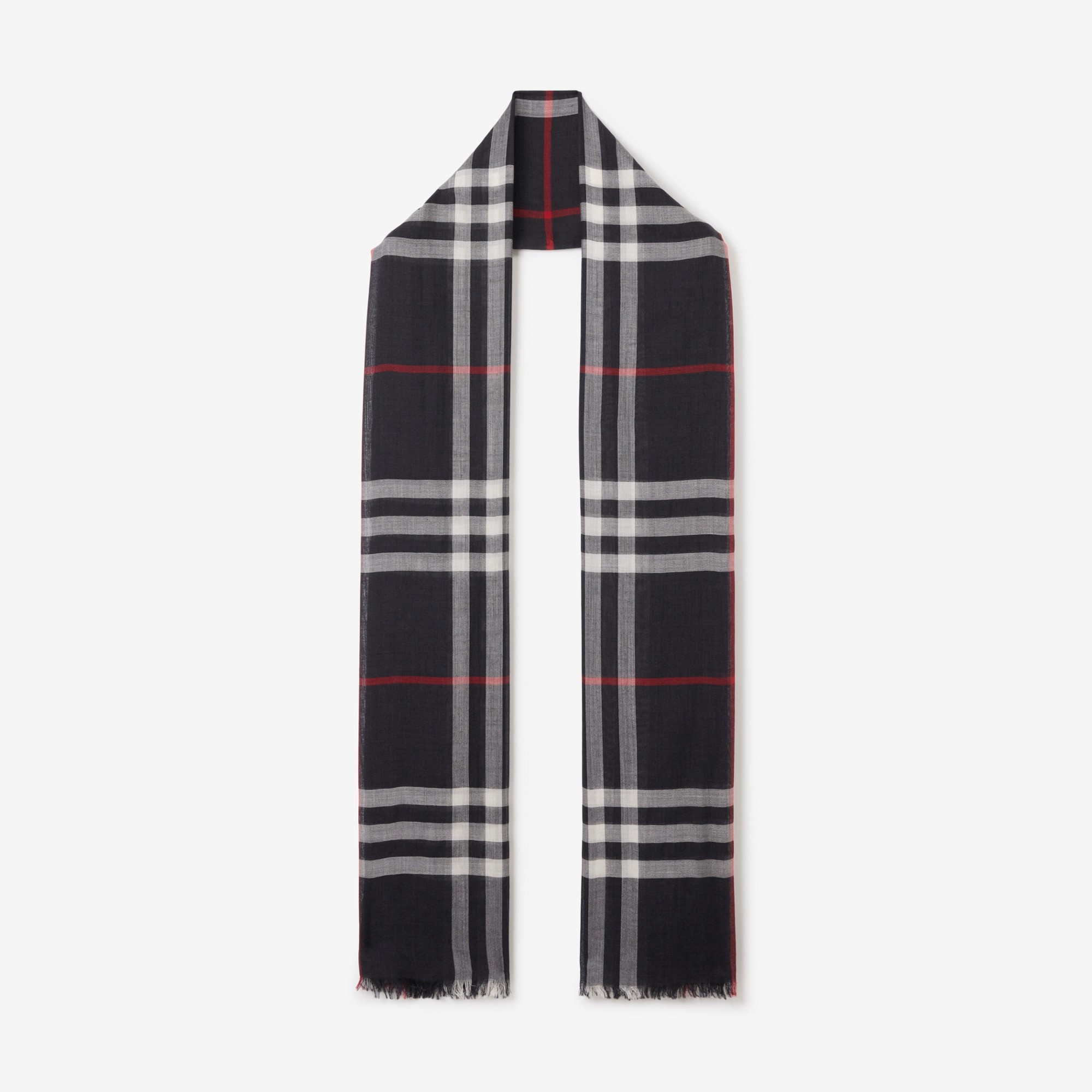 PRODUCT DETAILS An Italian-made wool-silk scarf in a lightweight gauze weave, highlighted with our Burberry Check. - 220 x 70cm/86.6 x 27.6in 51% wool, 49% silk* Rectangular Eyelash fringing at the edges Dry clean Made in Italy *100% of the wool in this product is responsibly sourced. Item 80558571