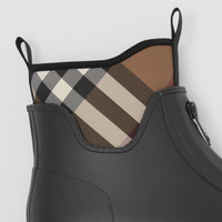 PRODUCT DETAILS A rubber rain boot reinterpreted with a removable check neoprene sock and a decorative front zip. Upper: 70% rubber, 30% polyester Lining: 100% polyester Sole: 100% rubber Heel: 100% rubber Slip-on style with pull tabs Printed Burberry lettering at heel Imported Burberry has created this product using high-quality natural rubber. To clean, wipe with a damp cloth or wash with lukewarm, soapy water. Do not use solvents. Over time there may be a release of protective wax, leaving a fine white deposit. This is normal and does not affect the quality of the boots. To remove, please wipe boots with a damp cloth. Store out of direct sunlight in a cool, dry location away from extreme sources of heat or cold and avoid contact with dark or bright items. 80536751