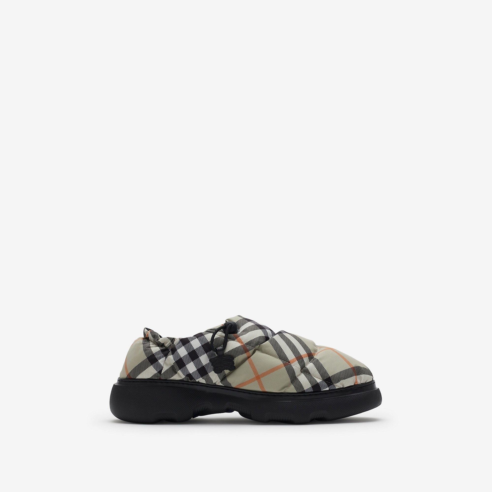 Product Details Quilted mules made in Italy from a nylon blend printed with the Burberry Check. The padded design features Equestrian Knight Design tags at the drawcords and chunky rubber soles moulded with archive Burberry lettering. Drawcord closure Rounded toe Burberry lettering at sole Equestrian Knight Design tags Comes with a dust bag - Item 80926491 Fabric & Care - Upper: 67% nylon, 33% polyester* - Trim: 30% nylon, 30% polyester, 20% brass, 20% thermoplastic polyurethane - Lining: 58% polyester, 42% calf leather - Sole: 85% EVA, 15% thermoplastic polyurethane - *The main material of this product is made with at least 70% recycled content - Made in Italy