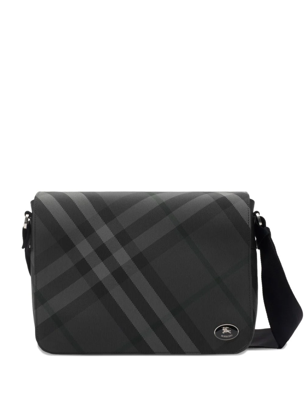 check-pattern messenger bag Highlights - Charcoal grey - Check pattern - Ribbed texture - Adjustable webbing strap - Magnetic closure Imported Composition Lining: Polyamide 100% Outer: Polyamide 90%, Polyurethane 10% SIZE & FIT Measurement DEPTH 2.75 in(7 cm) HEIGHT 9.05 in(23 cm) WIDTH 11.02 in(28 cm)