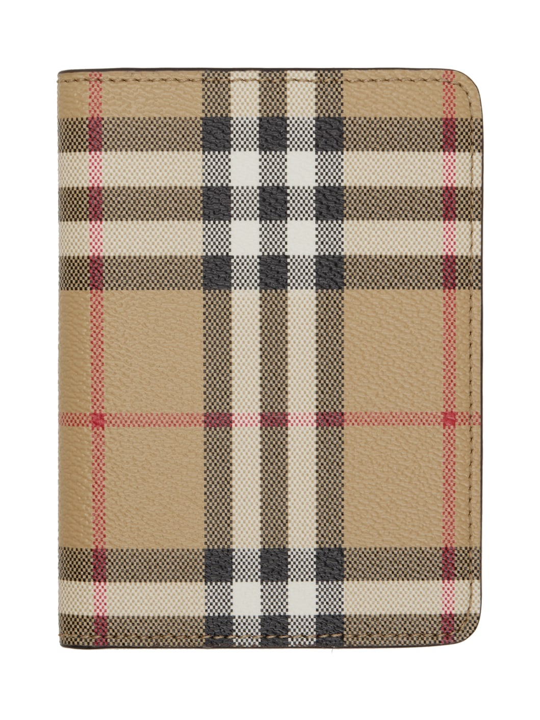 Coated canvas passport holder in beige. · Signature check pattern throughout · Four card slots · One patch pocket · One passport slot · Canvas lining · H5.25" x W4" x D0.5" Supplier color: Archive beige