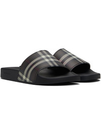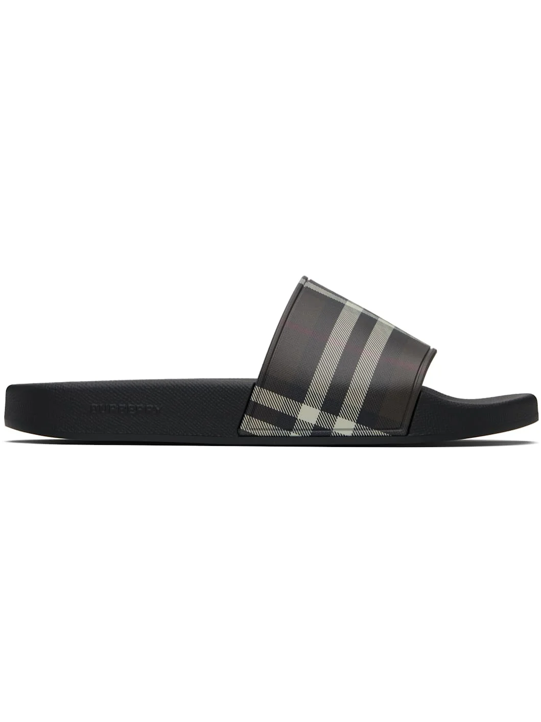 Rubber pool slides. · Open toe · Check pattern at vamp · Logo embossed at molded footbed · Treaded rubber sole Supplier color: Mahogany check Rubber. Made in Italy 252376M234003