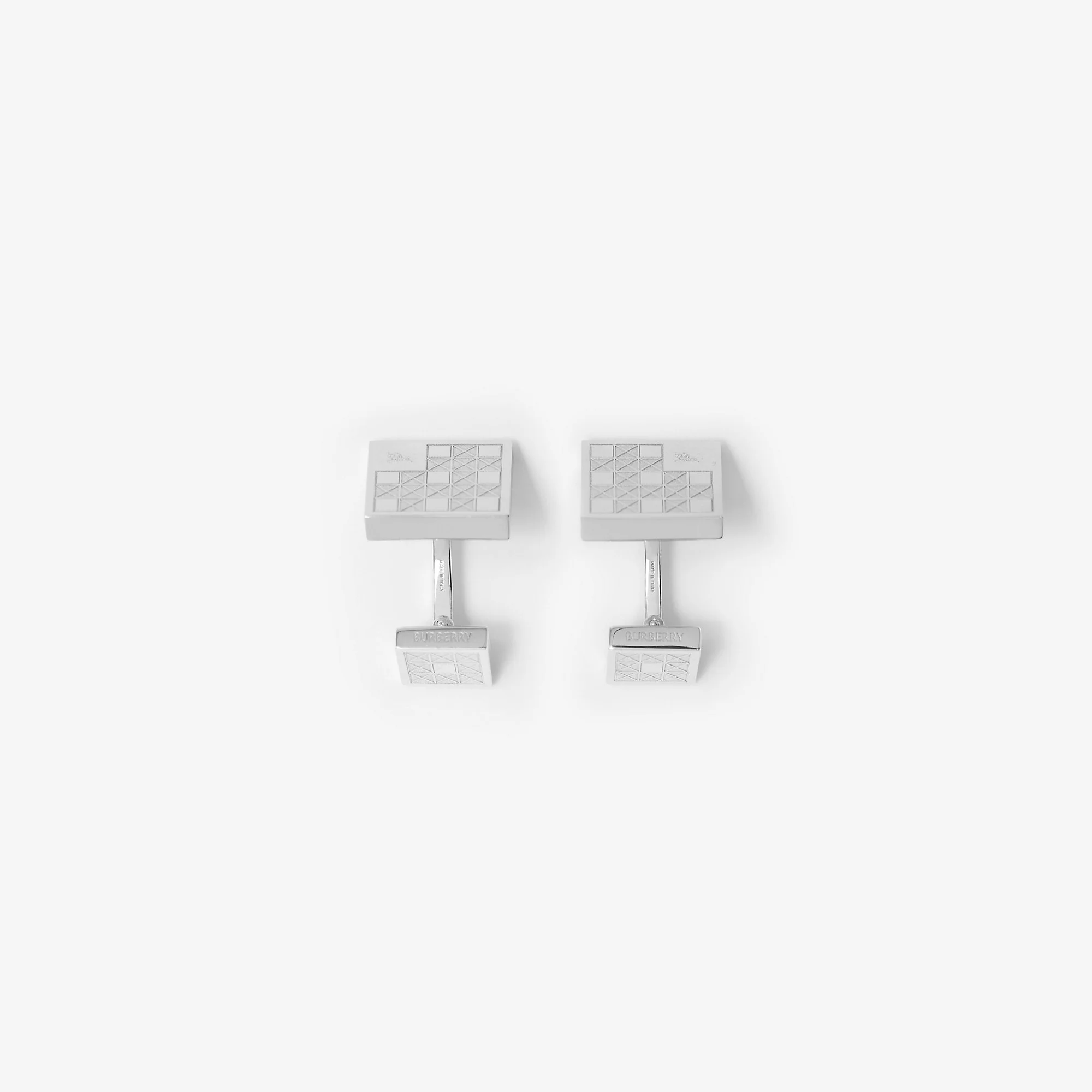 Product Details A pair of cufflinks made in Italy from sterling silver. The design is sculpted with a geometric check and our Equestrian Knight Design. - Engraved Burberry lettering at back - Comes with a dustbag - Item 80968091 Fabric & Care - 100% sterling silver - Made in Italy