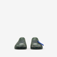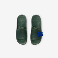 Product Details A pair of slides made in Italy from transparent rubber with a Burberry Check upper. The perforated upper features a detachable Equestrian Knight Design charm. - Rounded toe - Burberry lettering at sole - Item 80903081 Fabric & Care - Upper: 100% rubber - Lining: 60% EVA, 40% polyester - Sole: 100% rubber - Made in Italy