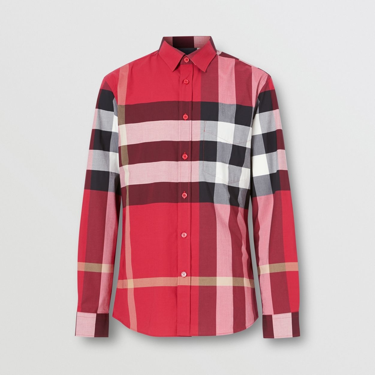 PRODUCT DETAILS A slim-fit shirt in stretch cotton poplin, reworked with an oversized check. Shirt length: 77cm/30.3in. This is based on a size UK M as proportions change slightly according to size. Model's height: 191cm/6ft 3in 95% cotton, 5% elastane Buttons: mother-of-pearl Single-button cuffs Point collar Chest patch pocket Curved hem Machine wash Imported 80198791