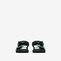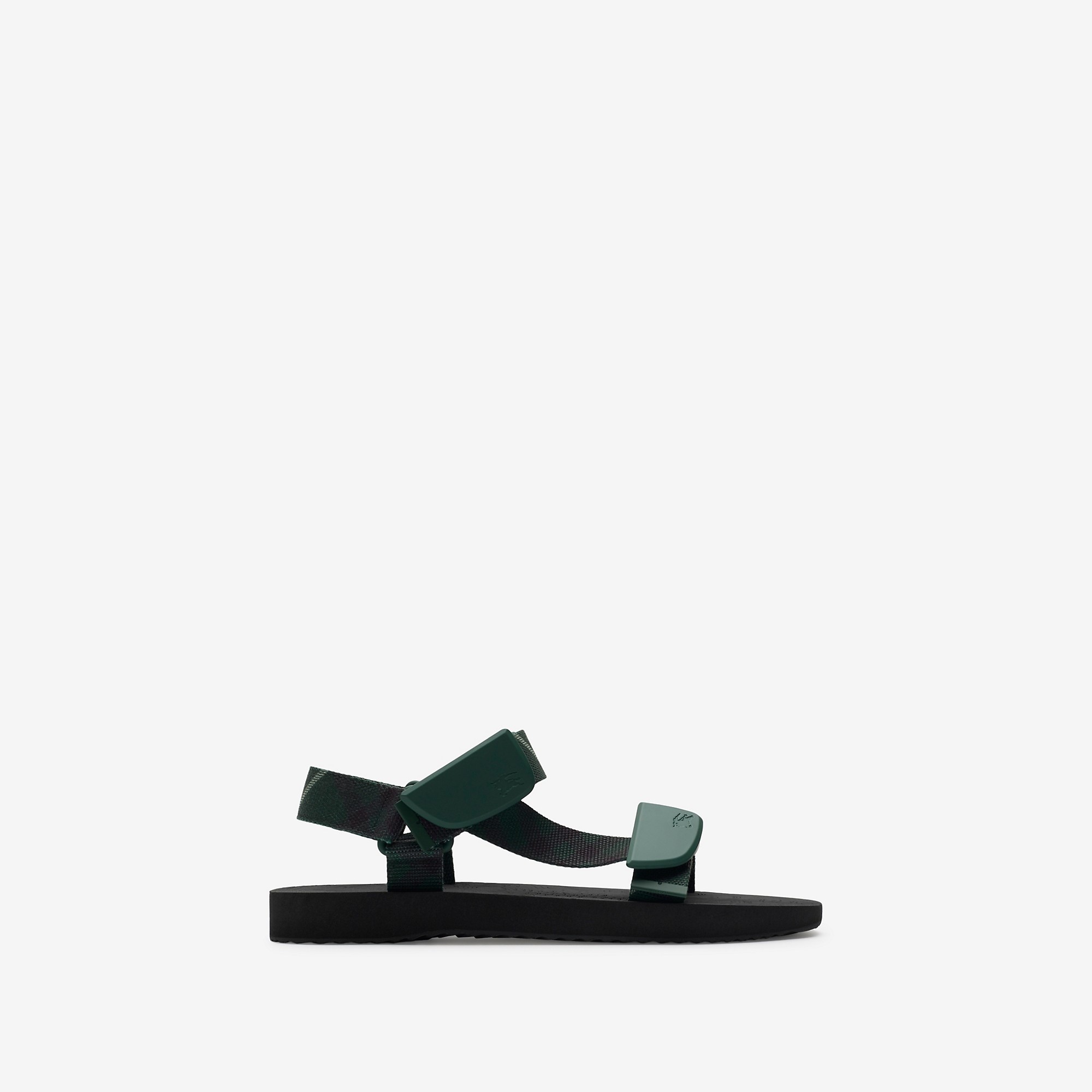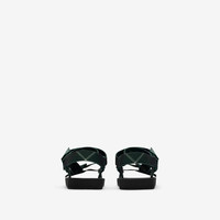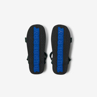 Product Details Italian-made sandals with adjustable webbing straps in Burberry Check. The rubberised shield buckles are embossed with the Equestrian Knight Design. - Rounded toe - Burberry lettering at sole - Comes with a dust bag - Item 80955201 Fabric & Care - Upper: 100% polyester - Trim: 80% polyamide, 20% brass - Lining: 70% EVA, 29% polyester, 1% sheep leather - Sole: 100% thermoplastic polyurethane - Made in Italy