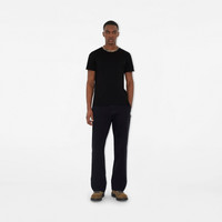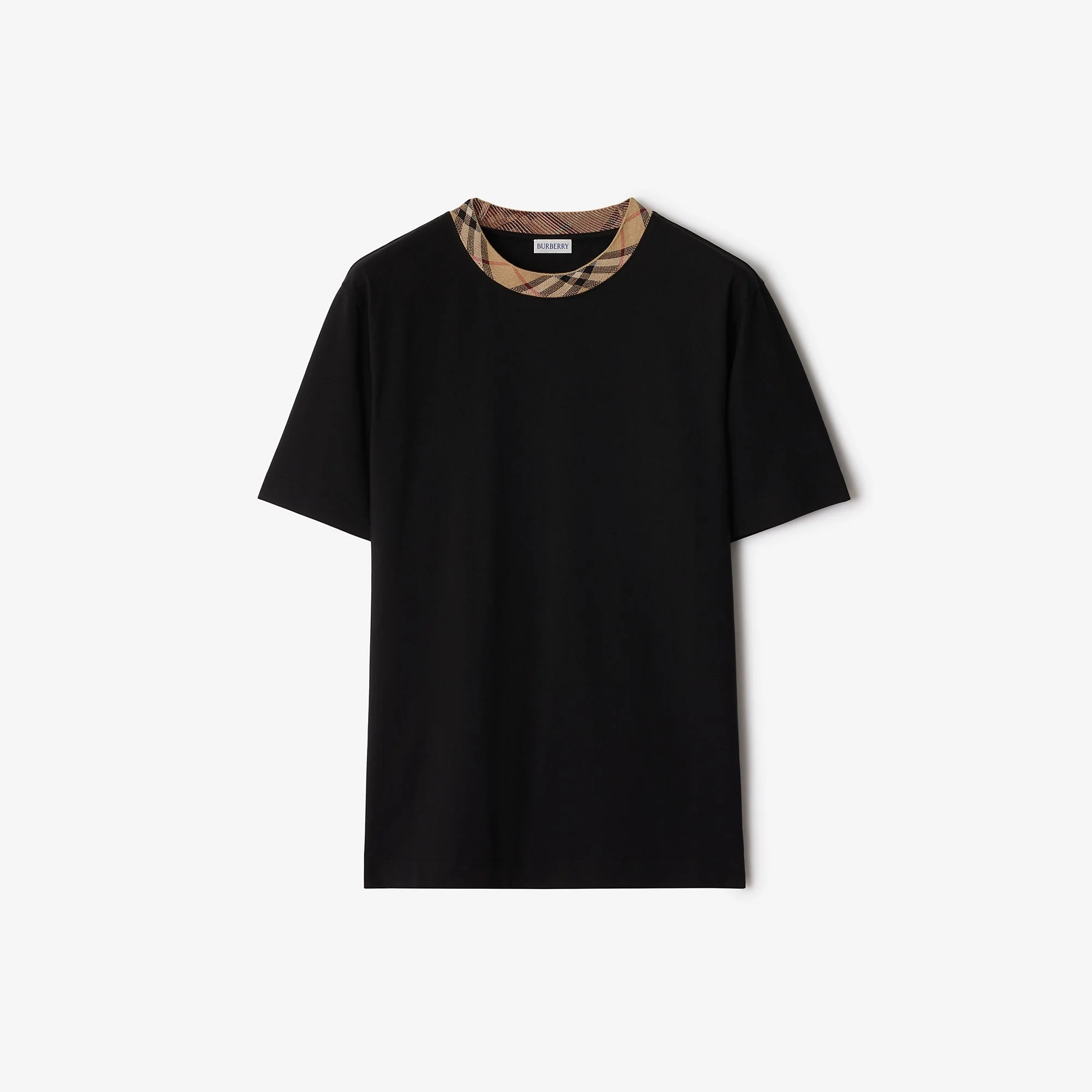 Product Details A crew-neck T-shirt in cotton jersey, cut to a relaxed fit. The design is detailed with Burberry Check taping in our signature sand colourway. - Rib-knit neckline - Relaxed fit: a looser cut than our regular fit. - Machine wash - Item 81101011 Size & Fit - Length: 72.5cm/28.5in (size UK M) - Model's height: 188cm/6ft 2in. Model wears size UK M Fabric & Care - 100% cotton - Trim: 91% cotton, 7% polyamide, 2% elastane - Made in Portugal