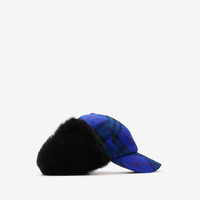 Product Details A padded cap made in Italy from wool flannel woven with the Burberry Check in signature Knight Blue. Inspired by trapper hats, the style features soft shearling-lined side panels with a shield-shaped buckle at the strap. - Adjustable buckled strap - Engraved Burberry lettering at buckle - Item 81196991 Fabric & Care - Outer: 100% wool - Trim: 100% real farmed dyed lamb shearling, ovis aries, country of origin: Spain - Lining: 100% cotton - Filling: 100% polyester - Made in Italy