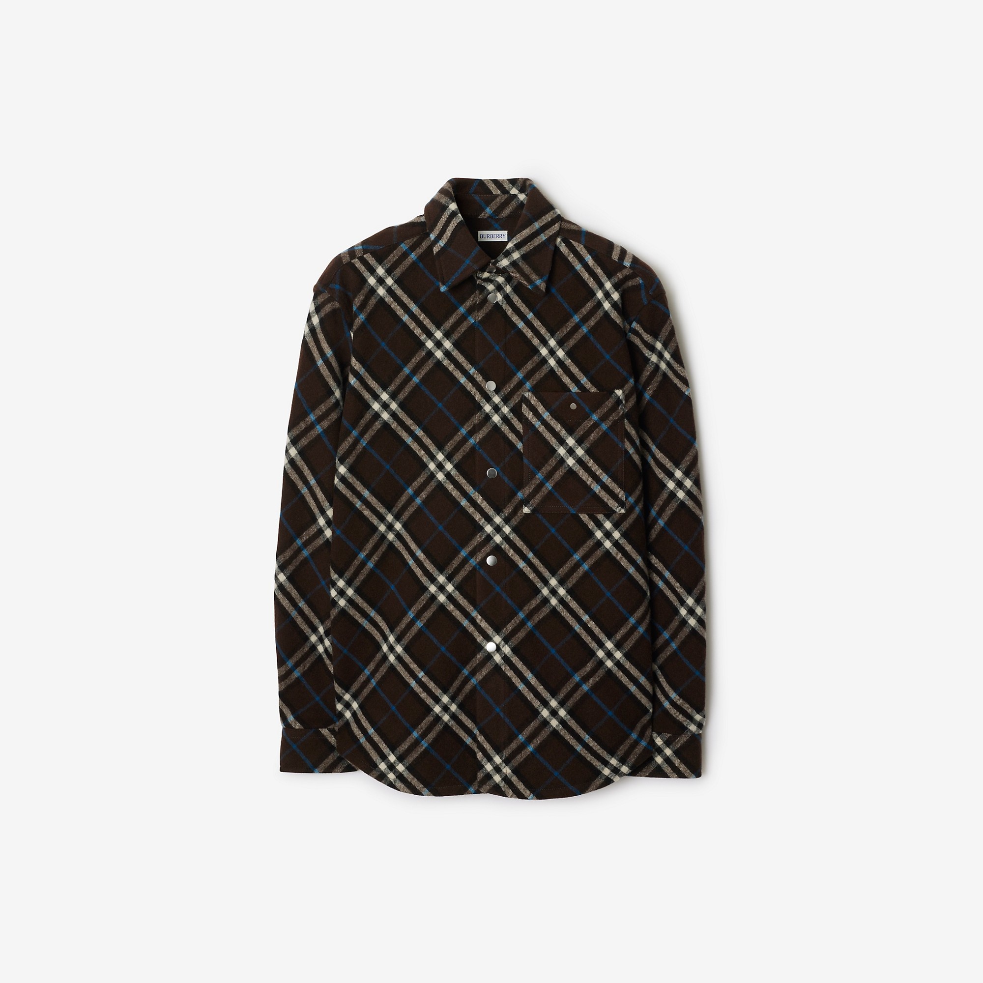 Product Details A shirt in wool flannel woven in Italy with the Burberry Check and cut to an oversized fit. - Press-stud closure - Point collar - Press-stud chest patch pocket - Single-button cuffs - Curved hem - Oversized fit: our loosest cut, designed for exaggerated proportions. We recommend sizing down. - Item 80992301 Size & Fit - Length: 79cm/31.1in (size UK M) - Model’s height: 186cm/6ft 1in. Model wears size UK M Fabric & Care - 100% wool - Specialist dry clean - Imported