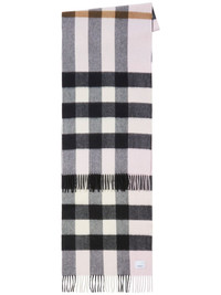 checked cashmere scarf Highlights - Light pink/multicolour - Cashmere - Knitted construction - Check pattern - Logo patch to the front - Fringed edge - Rectangle shape - Wraparound style Made in United Kingdom Composition Cashmere 100%