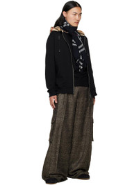 Rectangular lightweight wool flannel scarf. · Check pattern throughout · Logo patch at face · Fringed detailing at edges · L78.75" x W35.5" Supplier color: Ink 100% wool. Made in Italy 252376M150012
