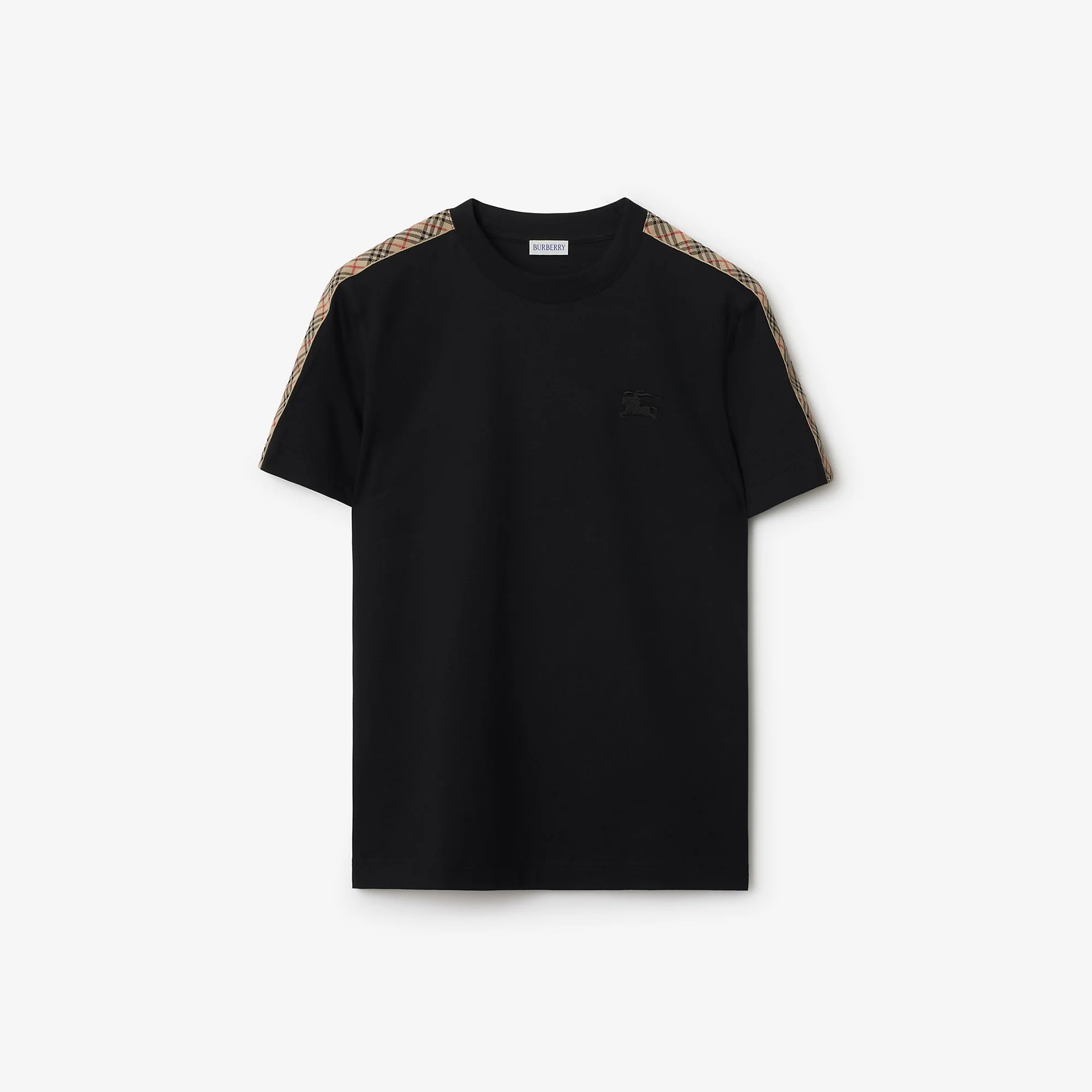 Product Details A T-shirt in lightweight cotton jersey, cut to a slim fit. The style is embroidered with the Equestrian Knight Design and framed with Burberry Check taping at the sleeves. - Rib-knit neckline - Embroidered Equestrian Knight Design at chest - Slim fit: this style is cut to a fitted silhouette. Fits true to size, take your normal size. - Machine wash - Item 81062481 Size & Fit - Length: 71.5cm/28.2in (size UK M) - Model’s height: 189cm/6ft 2in. Model wears size UK M Fabric & Care - 100% cotton - Trim: 98% cotton, 2% elastane - Imported