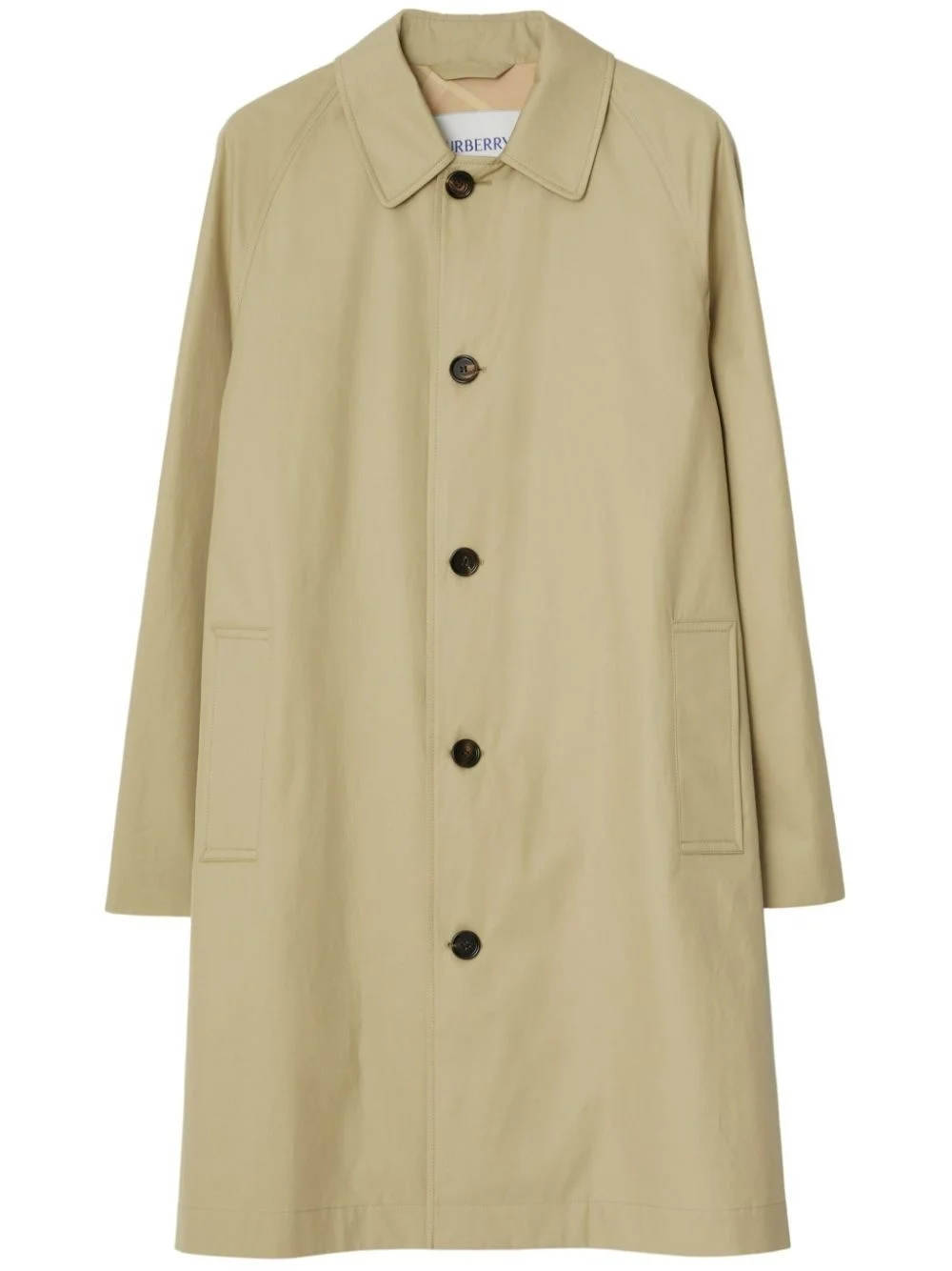 classic above-the-knee raincoat One of its classic, Burberry's raincoat is a hallmark created by Thomas Burberry, brand's founder, over 100 years ago. The design is seen here, presented in its traditional beige hue, fastened with buffalo horn front buttons. Highlights - Beige - Cotton - Classic collar - Front button fastening - Two side flap pockets - Long raglan sleeves - Belted cuffs - Central rear vent - Above-knee length - Straight hem Made in United Kingdom Composition Lining: Viscose 100%, Cotton 100% Outer: Cotton 100%, Buffalo Horn 100% Washing instructions Read Manufacturer Guidelines