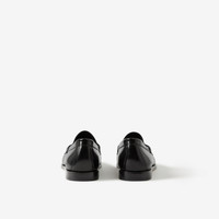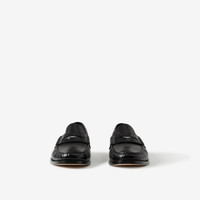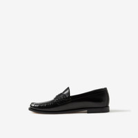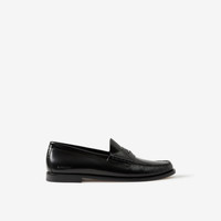PRODUCT DETAILS Italian-crafted penny loafers in leather, detailed with a palladium-plated coin engraved with our logo. Upper: 100% calf leather Trim: 100% brass with palladium plating Lining: 80% calf leather, 15% polyester, 5% polyurethane Sole: 100% calf leather Slip-on style Almond-shaped toe Polished hardware Embossed Burberry Lettering at the side Made in Italy Item 80647721