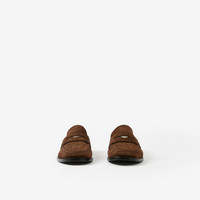 PRODUCT DETAILS Detailed with a palladium-plated coin engraved with our logo. Upper: 100% calf suede Trim: 100% brass with palladium plating Lining: 100% calf leather Sole: 100% calf leather Slip-on style Almond-shaped toe Polished metal hardware Embossed Burberry lettering at side Made in Italy Item 80708161