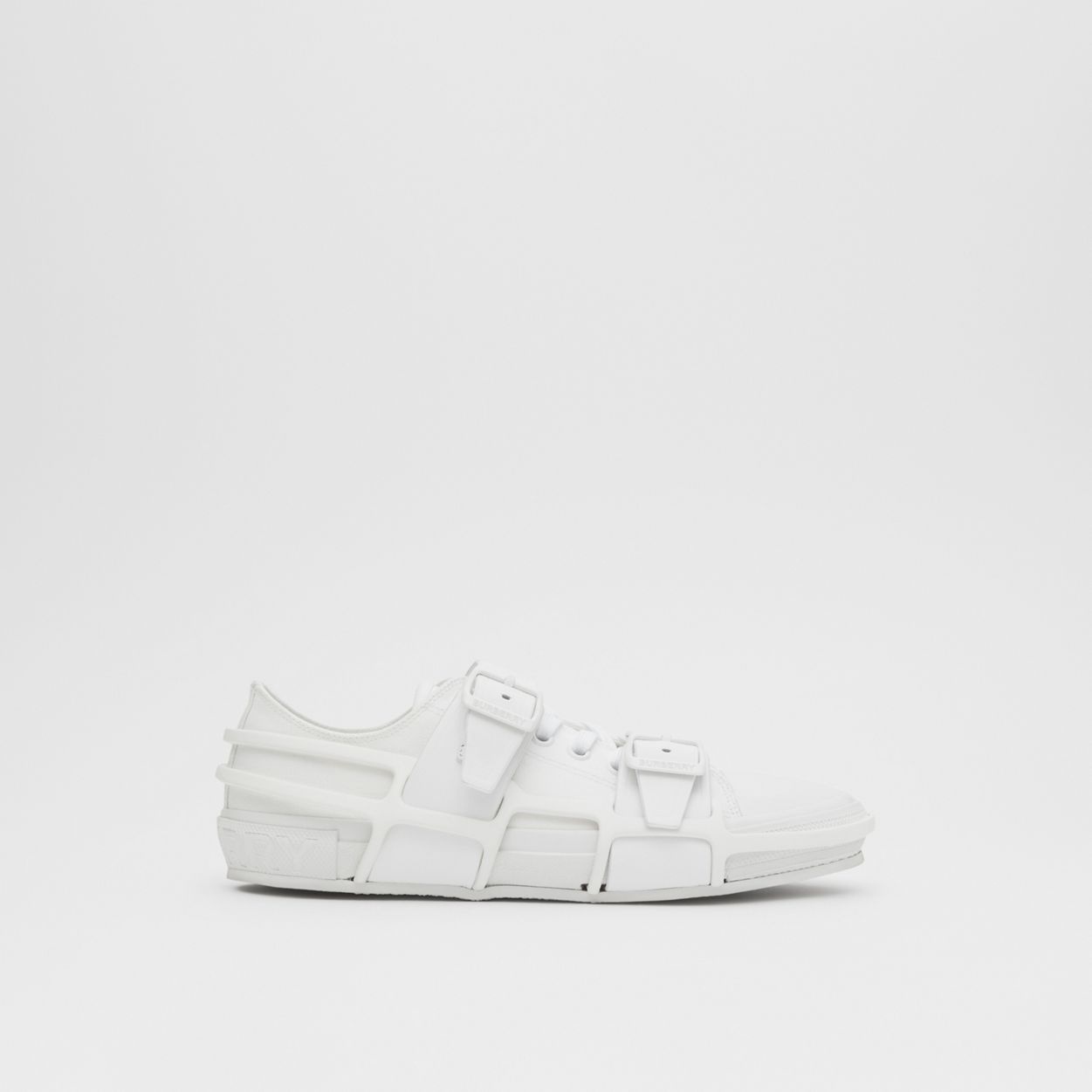 PRODUCT DETAILS A timeless sneaker silhouette reinterpreted for the runway in a structured frame with buckled leather straps. Upper: 65% cotton, 20% calf leather, 10% polyurethane, 5% rubber Trim: 100% polyamide Lining: 50% cotton, 50% polyamide Sole: 100% rubber Lace-up and buckle closure Embossed Burberry lettering at heel Made in Italy 80277871