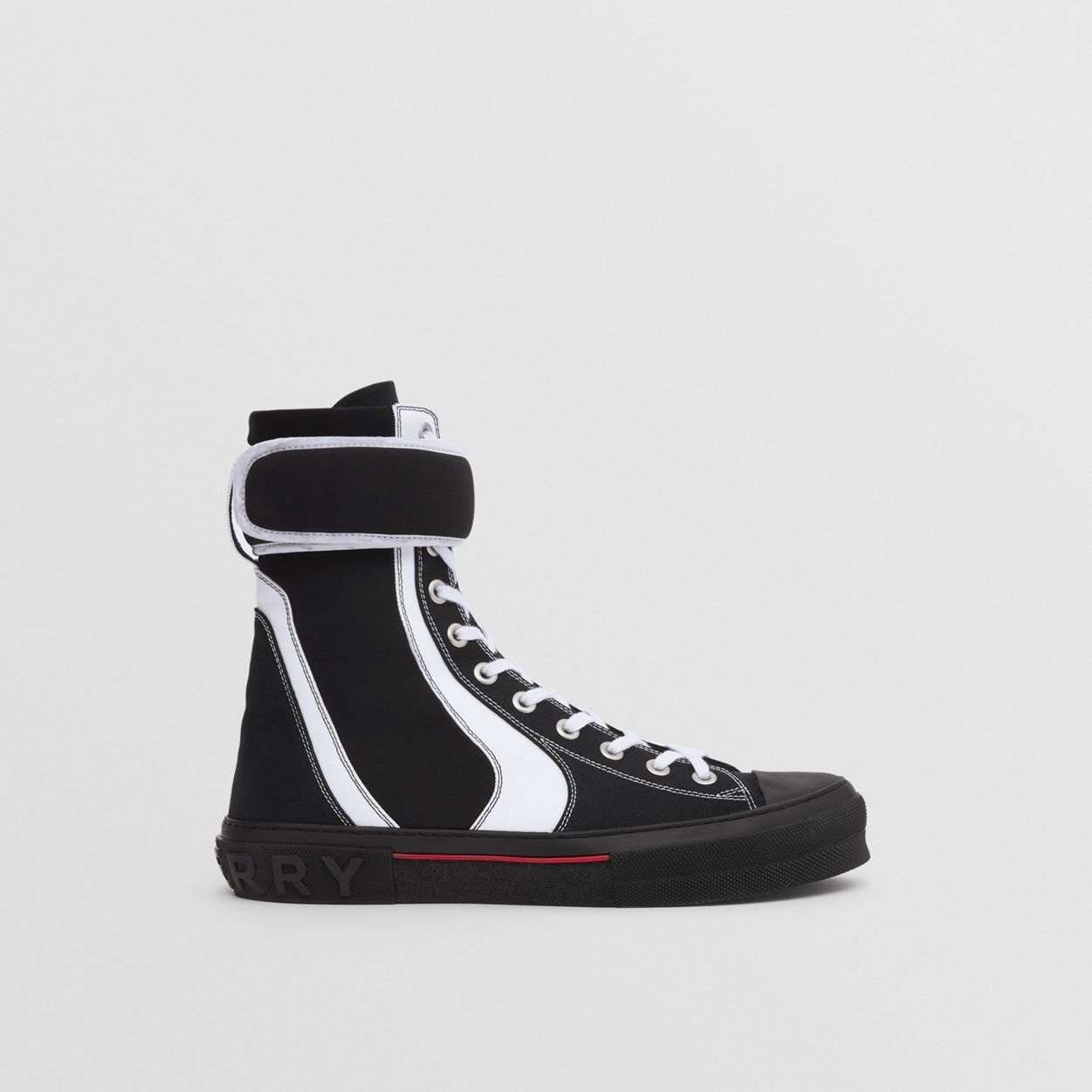 PRODUCT DETAILS Our runway sneakers in cotton and technical stretch nylon. The design made its debut in Riccardo Tisci’s Spring/Summer 2022 collection and is detailed with a panelled upper and ankle strap inspired by scuba diving footwear. Upper: 55% cotton, 20% polyamide, 20% polyester, 5% elastane Trim: 40% polyamide, 30% brass, 20% polyester, 10% rubber Lining: 59% polyamide, 22% sheep leather, 14% elastane, 3% polyester, 2% polyurethane Sole: 100% rubber Lace-up and Velcro strap closure Embossed Burberry lettering at heel Made in Italy 80523381