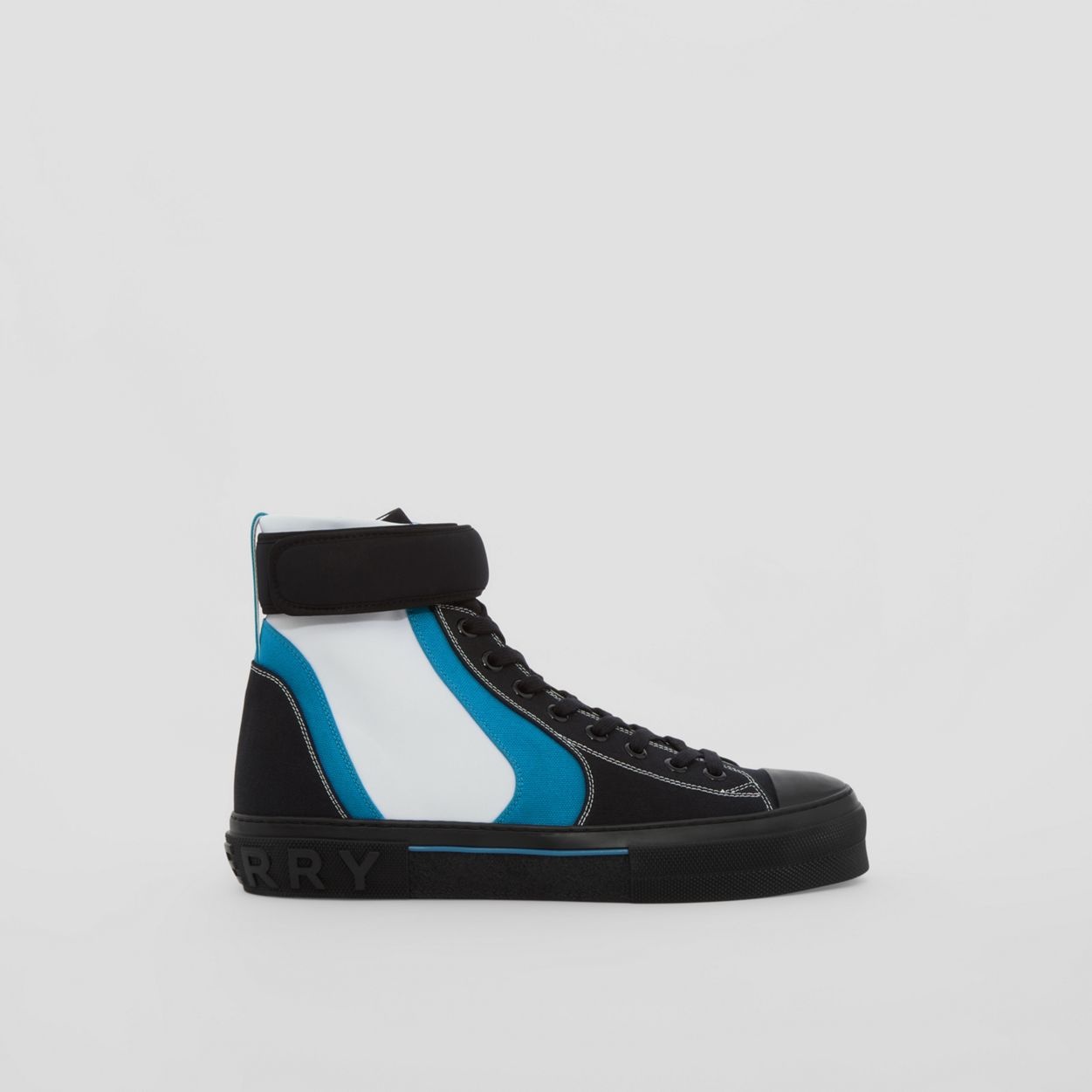 PRODUCT DETAILS Our runway sneakers in cotton and technical stretch nylon. The design made its debut in Riccardo Tisci’s Spring/Summer 2022 collection and is detailed with a panelled upper and ankle strap inspired by scuba diving footwear. Upper: 57% cotton, 24% polyester, 13% polyamide, 6% elastane Trim: 40% polyamide, 30% brass, 20% polyester, 10% rubber Lining: 42% polyester, 41% sheep leather, 10% elastane, 7% goat suede Sole: 100% rubber Lace-up and Velcro strap closure Embossed Burberry lettering at heel Made in Italy 80557661
