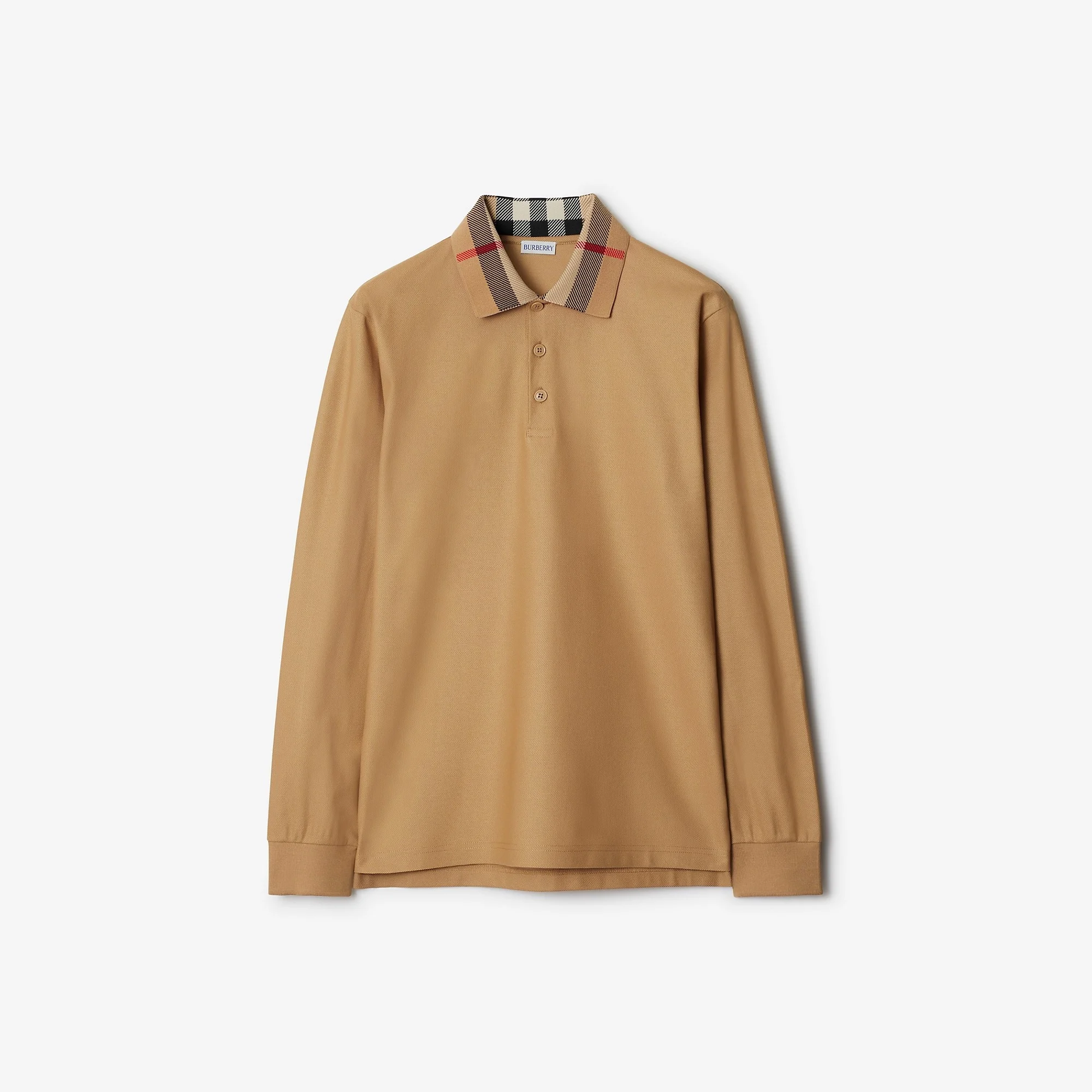 Product Details A long-sleeved polo shirt in cotton pique, topped with a knitted Burberry Check collar. The design is cut to a slim fit. - Button placket - Rib-knit cuffs - Slim fit: this style is cut to a fitted silhouette. Fits true to size, take your normal size. - Machine wash - Item 80988111 Size & Fit - Length: 74.5cm/29.3in (size UK L) - Model’s height: 186cm/6ft 1in. Model wears size UK L Fabric & Care - 100% cotton - Trims: 97% cotton, 3% elastane; 63% polyester, 31% polyamide, 6% elastane - Made in Portugal