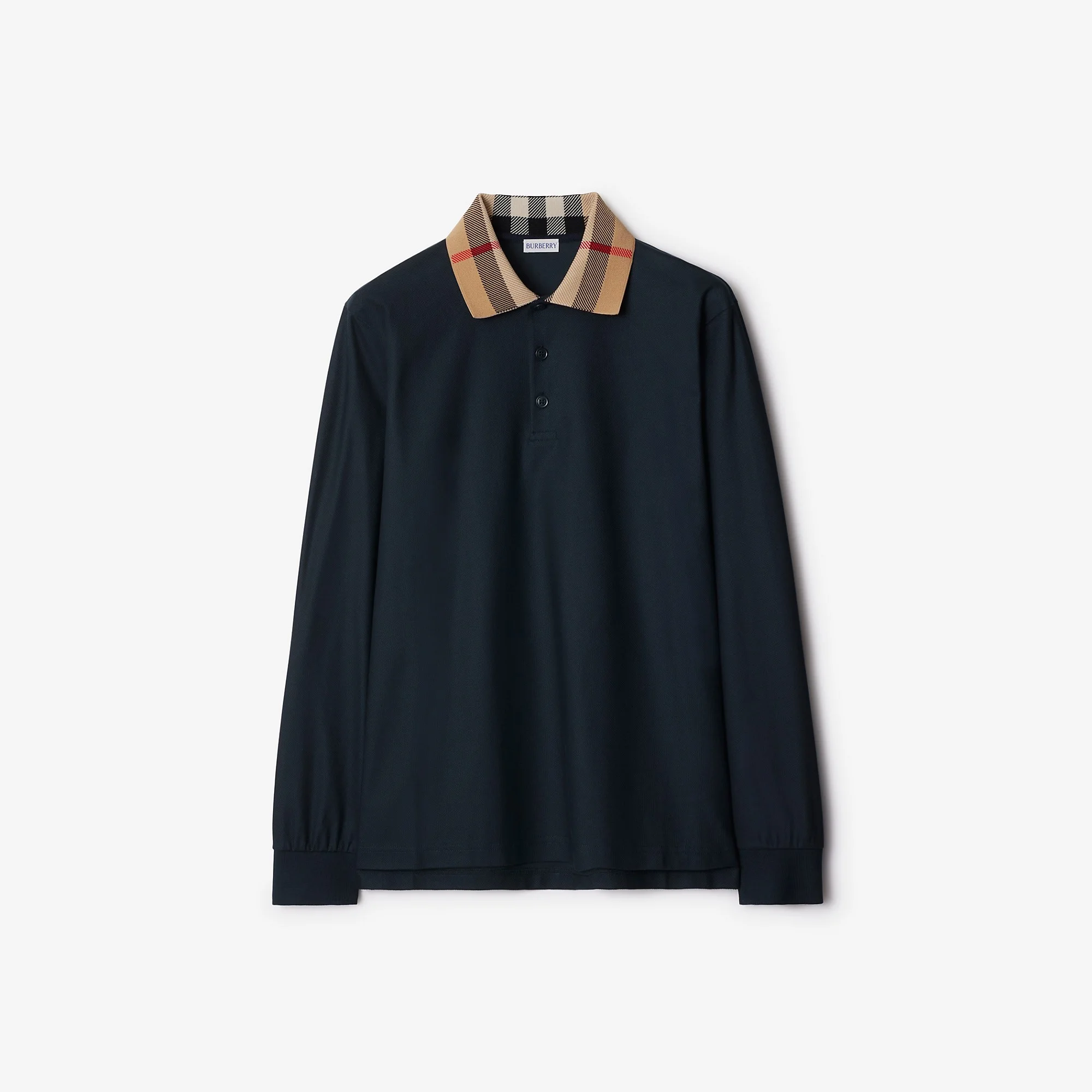 Product Details A long-sleeved polo shirt in cotton pique, topped with a knitted Burberry Check collar. The design is cut to a slim fit. - Button placket - Rib-knit cuffs - Slim fit: this style is cut to a fitted silhouette. Fits true to size, take your normal size. - Machine wash - Item 80988131 Size & Fit - Length: 74.5cm/29.3in (size UK L) - Model’s height: 186cm/6ft 1in. Model wears size UK L Fabric & Care - 100% cotton - Trims: 97% cotton, 3% elastane; 63% polyester, 31% polyamide, 6% elastane - Made in Portugal