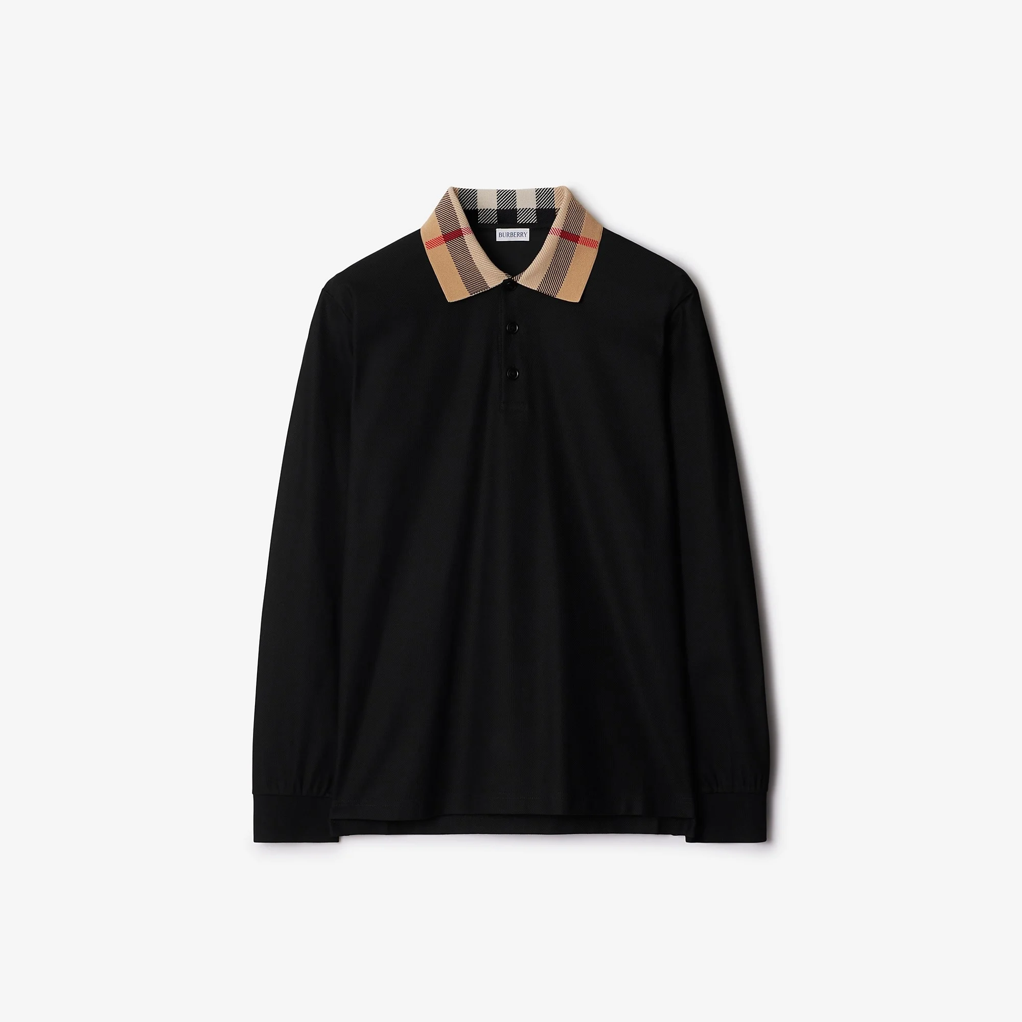 Product Details A long-sleeved polo shirt in cotton pique, topped with a knitted Burberry Check collar. The design is cut to a slim fit. - Button placket - Rib-knit cuffs - Slim fit: this style is cut to a fitted silhouette. Fits true to size, take your normal size. - Machine wash - Item 80988121 Size & Fit - Length: 74.5cm/29.3in (size UK L) - Model’s height: 186cm/6ft 1in. Model wears size UK L Fabric & Care - 100% cotton - Trims: 97% cotton, 3% elastane; 63% polyester, 31% polyamide, 6% elastane - Made in Portugal