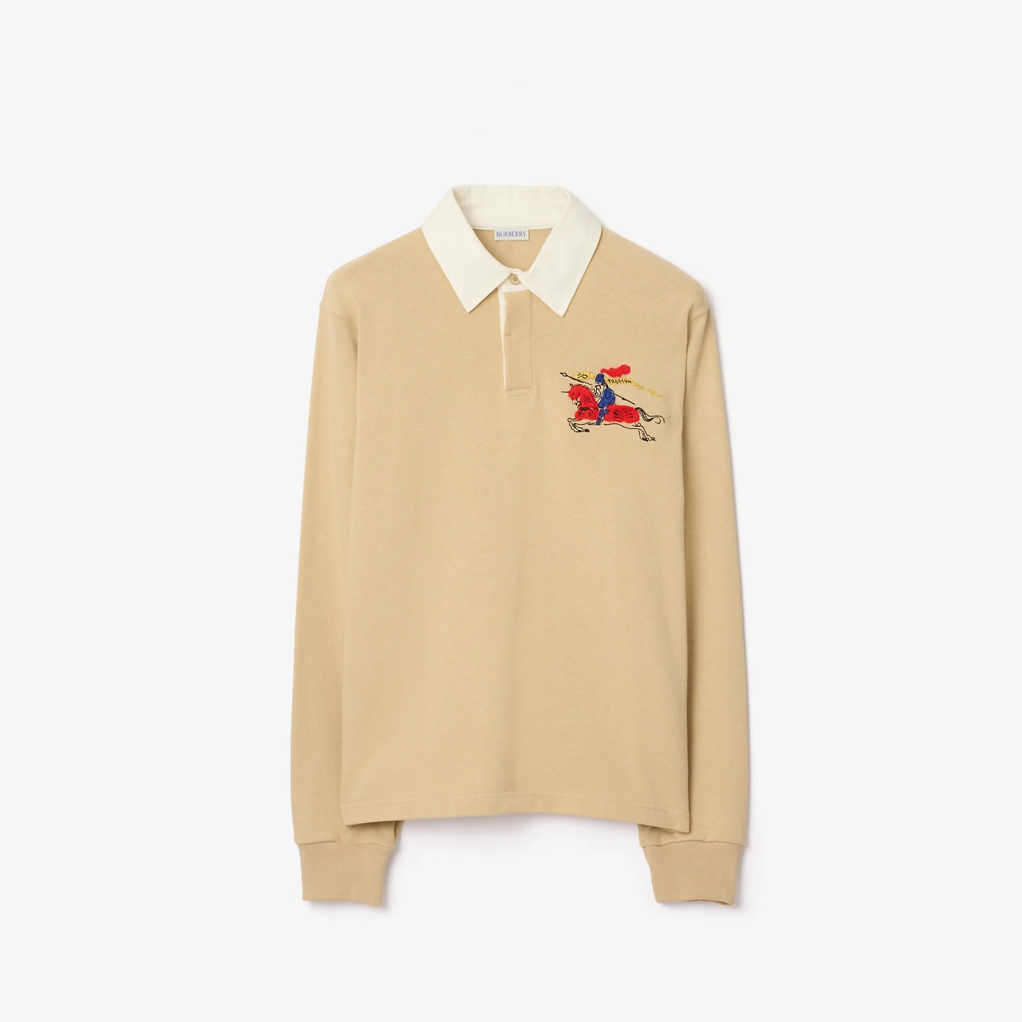 Product Details Relaxed fit: a looser cut than our regular fit. A long-sleeved rugby shirt in cotton jersey, detailed with a contrasting collar and concealed button placket. Created as part of our Year of the Horse capsule, the style playfully reimagines the Equestrian Knight Design house code in textural and metallic threads. - Button placket - Rib-knit cuffs - Embroidered Equestrian Knight Design at chest - Machine wash - Item 81182961 Size & Fit - Relaxed fit: a looser cut than our regular fit. - Length: 72.5cm/28.5in (size UK M) - Model’s height: 184cm/6ft. Model wears size UK M Fabric & Care - 100% cotton - Collar: 100% cotton - Trims: 96% cotton, 4% elastane; 34% viscose, 25% wool, 24% acrylic, 9% polyester, 5% metallic fibre, 3% polyamide - Buttons: mother-of-pearl - Made in Portugal