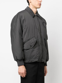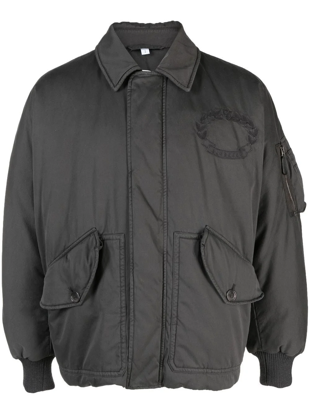 embroidered-logo bomber jacket dark grey cotton padded design down-feather filling embroidered logo classic collar long sleeves Made in Italy Composition Outer: Cotton 100% Lining: Cotton 100%, Goose Down 90%, Feather 10% SIZE & FIT Model measurements Height 6 ft 2 in(1.87 m) Bust/Chest 36.41 in(92.5 cm) Hips 35.43 in(90 cm) Waist 29.52 in(75 cm) FittingInformation This piece fits true to size. We recommend you get your regular size Cut for a loose fit Made with a mid-weight fabric