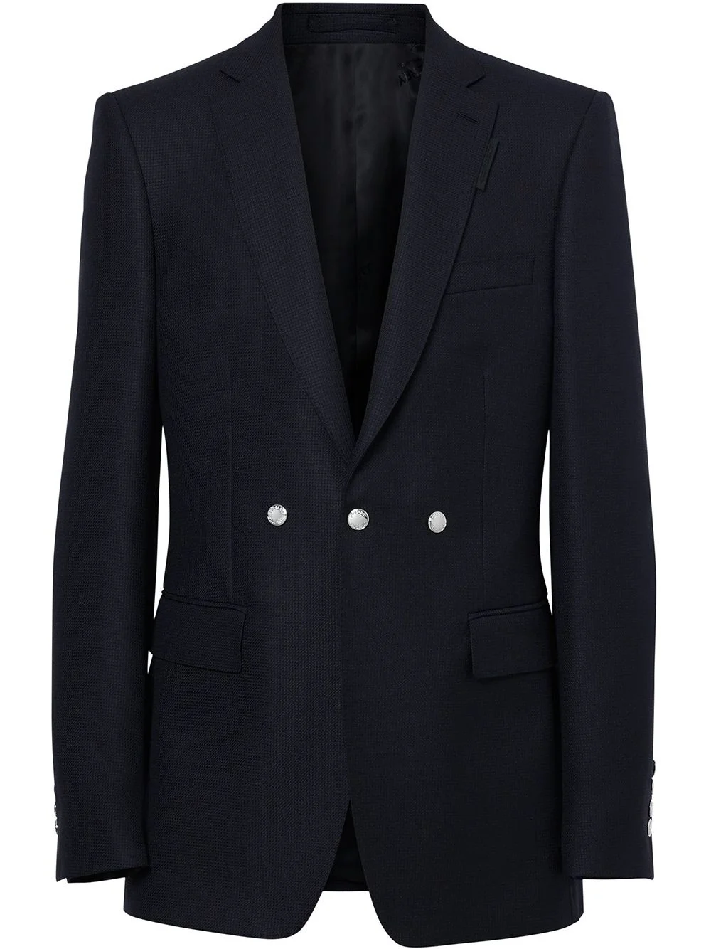 English Fit Triple Stud Wool Mohair Tailored Jacket A quintessentially British brand, Burberry creates iconic designs that seamlessly infuse their rich heritage with a contemporary aesthetic. This navy blue wool and linen blend English Fit Triple Stud Wool Mohair Tailored Jacket from Burberry features structured shoulders, notched lapels, a broad welt chest pocket, long sleeves, three silver-tone logo-engraved studs to the front, front flap pockets and a double vent to the rear. Made in Italy Composition Buffalo Horn 100%, Linen/Flax 50%, Acetate 50%, Cupro 50%, Wool 32%, Viscose 18% Lining: Cupro 100% Outer: Wool 90%, Mohair 10% SIZE & FIT Measurement LENGTH 29.92 in(76 cm) Washing instructions Specialist Cleaning