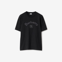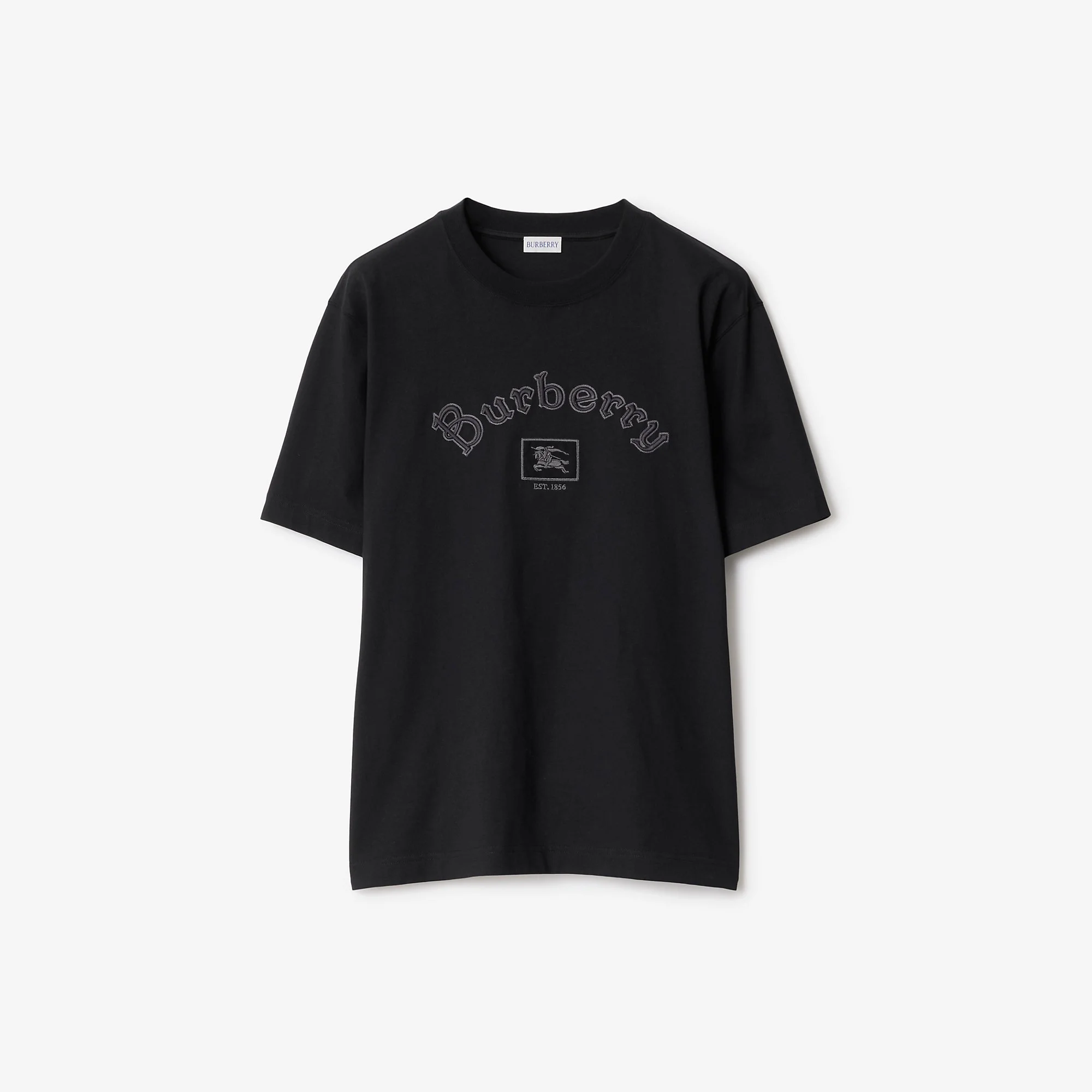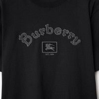 Product Details A T-shirt made from cotton jersey, cut to a relaxed fit. The crew-neck style is embroidered with our Equestrian Knight Design and an archival logo from the 1940s. - Rib-knit neckline - Embroidered Burberry lettering at chest - Relaxed fit: a looser cut than our regular fit. - Machine wash - Item 81160611 Size & Fit - Length: 72.5cm/28.5in (size UK M) - Model’s height: 187cm/6ft 2in. Model wears size UK M Fabric & Care - 100% cotton - Trim: 97% cotton, 3% elastane - Made in Portugal